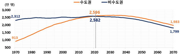 서울, 인천 그리고 경기도를 아우르는 수도권은 전체 국토 면적의 약 12% 차지한다. 이 지역의 인구는 꾸준히 증가해왔고, 2020년에는 인구통계를 조사하기 시작한 이래 처음으로 비수도권 전체의 인구를 넘어섰다. 전체 면적의 88%를 점유하는 비수도권보다 12%의 수도권에 더 많은 사람들이 살게 된 것이다.