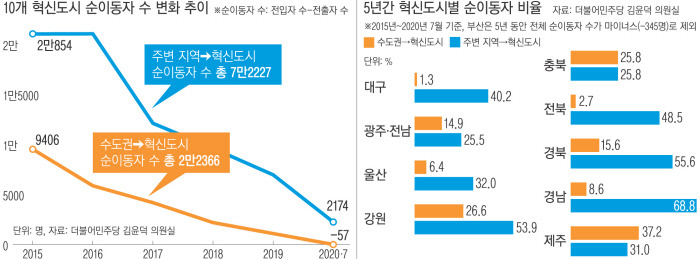 균형발전을 위해 중앙정부에서 가장 중점적으로 추진한 사업은 공공기관 이전과 함께 진행한 지방혁신도시 건설이었다. 강제성을 동원해서라도 양질의 일자리를 옮겨 놓으면 연관 기업과 사람들이 모일 것으로 기대했다. 여러 곳의 혁신도시가 만들어지고 해당 지역 내 인구는 늘어났지만 본래의 역할은 제대로 해냈다고 보긴 어렵다. 당초 기대와 달리 혁신도시에는 수도권 보다 주변 지역으로부터 전입된 인구가 많았기 때문이다. 이는 제주를 제외한 거의 모든 지역의 혁신도시에서 공통적으로 나타난 현상이다. 더구나 공공기관 이전이 어느 정도 마무리된 시점부터는 수도권으로부터 전입되는 인구는 현저히 줄어들고, 역으로 수도권으로 전출하는 인구가 늘어나고 있는 실정이라고 한다.
