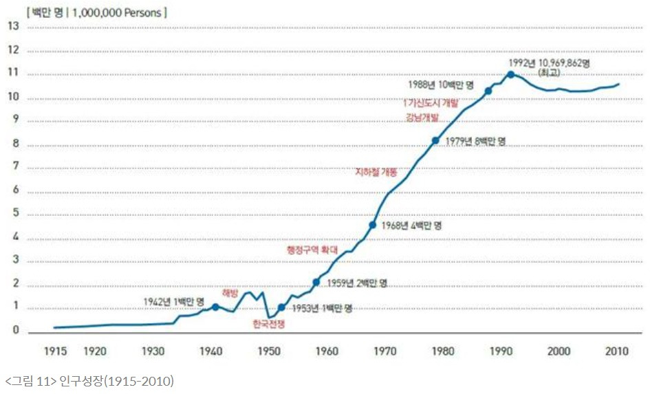 한강 이남지역 개발이 시작된 가장 큰 이유 중 하나는 한국전쟁 후 급격히 늘어나기 시작한 인구였다. 1955년 157만 명에 불과했던 서울의 인구는 1966년이 되자 두 배가 넘는 379만 명에 이르렀고, 폭발적 증가 추세는 1990년 1,000만 명에 이를 때까지 계속된다.