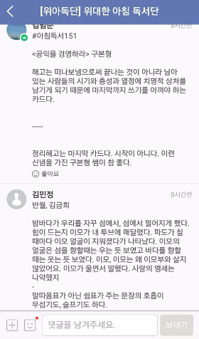 2016년 1월부터 지금까지 많은 사람들이 이 곳에서 자신이 좋아하는 문장과 생각을 꺼내놓았다. 스쳐 지나간 인연들도 있었고, 1년 반동안 지금까지 계속 함께해오는 사람들도 있다. 매일매일 올리는 사람들도 있었고, 한번도 올리지 않은 사람들도 있었다. 그것은 중요하지 않다. 내게 중요한 건 다양한 사람들이 가지각색의 문장과 생각을 이곳에 매일매일 올린다는 점이다. 이게 참 재미있다. 그래서 계속해서 하고 싶다. 그리고 가끔 위아독단 멤버들이 "위아독단 덕분에 책을 꾸준히 많이 읽어서 좋아요', '덕분에 아침에 폰 대신 책을 보게 되었어요'라는 말을 해주는 데, 언제들어도 기분이 참 좋은 말이다. 이 말은 나를 두근거리고 설레이게 만든다. 나를 움직이는 원동력 중 하나다.