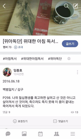 위아독단 네이버밴드에 아침 독서 도중 만났던 좋은 문장과 글, 자신의 생각과 느낌을 공유해주면 된다. 매일매일 하지 않아도 된다. 1주일에 한두번만 해도 된다. 많은 양을 읽지 않아도 된다. 한줄을 읽든, 한장을 읽든, 한권을 읽든 자신의 상황에 맞게 읽으면 된다. 다만, 한달에 10번 이상 하지 않으면 그 다음달을 계속 할 수 없다는 모임의 규칙이 있다.