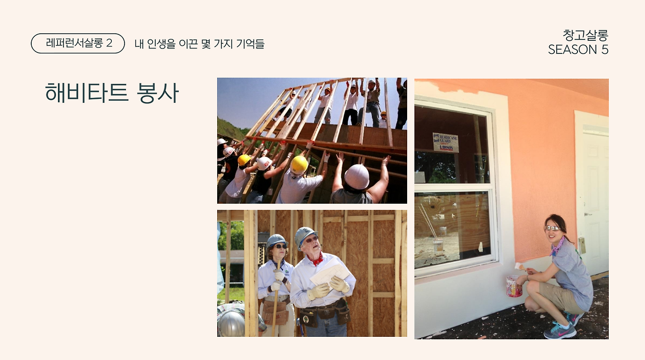 대학교 학보사 기자시절 철거민 빈민활동 참여한 '기억'이 주거와 집에 대한 소중함으로 이어지고, 취직 후 회사에서 하는 마이애미 해비타트 봉사 참여로 망설임 없이 이어졌다고 해요.