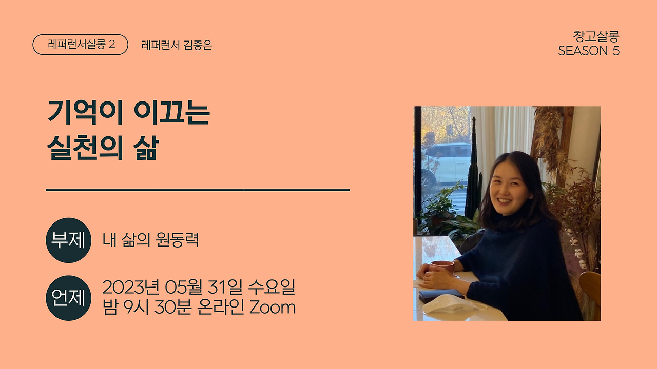 창고살롱의 시즌5 주제는 <Live Today! 삶의 끝에서 바라본 오늘>입니다. 창고살롱 시그니처 프로그램인 레퍼런서 살롱 두 번째 연사는 시즌2부터 그림책 테라피스트로 조용하고, 활발하고, 꾸준히 활동하고 계신(^^) 레퍼런서 종은 님의 서사를 준비했어요. <기억이 이끄는 실천의 삶> 제목으로 그녀의 일과 삶, 고유한 서사를 나눠 주셨습니다.