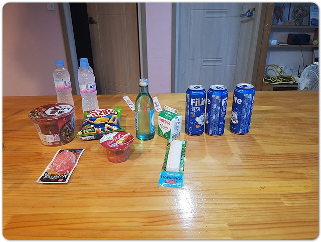 택시를 타고 가서 만난 편의점에서 사온 저녁. 다먹진 않았으나 먹기전 이것만 봐도 행복한 마음이 들었다. 아무도 없는 펜션에서 나홀로 8인상을 이용하며 즐거운 저녁 시간을 보냈다.