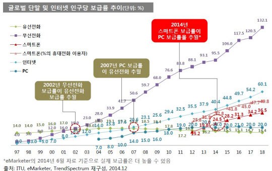 의미있는 추세는 스마트폰의 보급률이 PC 보급율을 지난 2014년에 추월한 것에 있으며, 이러한 물리적 인프라의 보급은 사물인터넷 서비스를 제공할 수 있는 인프라를 전세계적으로 구축해 나가고 있다는 것이다.