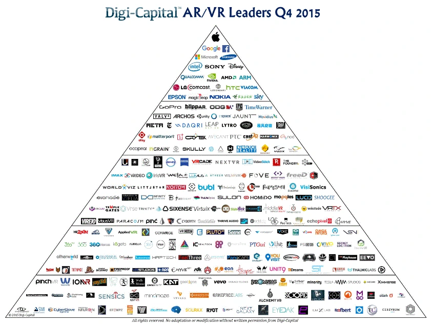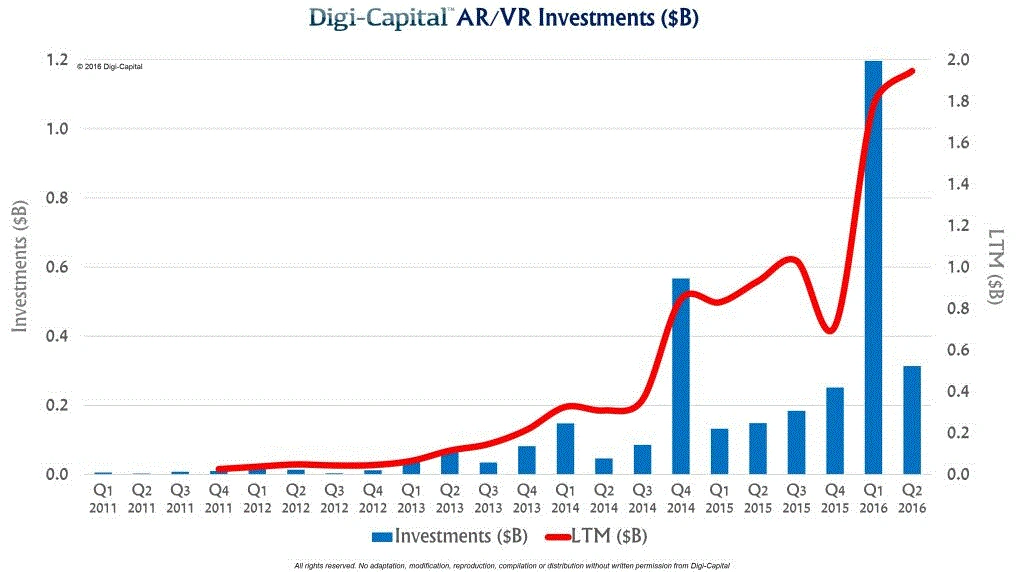 조사전문업체인 Digicapital 통계에 의하면, 지난 12개월동안 AR/VR 투자규모액은 지속적으로 증가하고 있으며, 특히 Q1 2016에는 수직적인 상승이 이루어지고 있음을 보여주고 있다. 2016년 1분기는 AR에 대한 글로벌 기업들간의 R&D 개발참여가 공론화 되던 시기로, 대기업들과 스타트업들을 중심으로 투자액의 증가가로 수치로서 나타난 것이다.