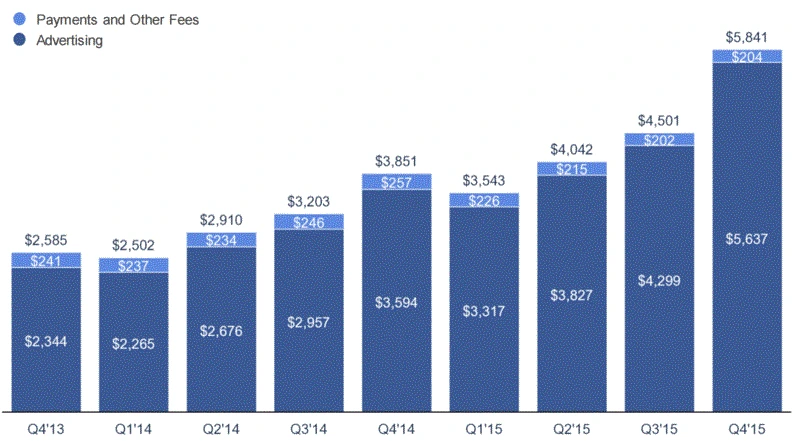 더 놀라운 것은 광고로만 2015년 4분기 기준 $56억달러 매출을 기록했다. 전분기 대비 30% 이상 성장이며, 전년도 동분기 대비 148% 성장에 이르는 수준이다. 이 같은 놀라운 성장이 가능한 것은 바로 '플랫폼 독점'에 따른 효과로서 나타나고 있다. Twitter는 더이상 Facebook의 경쟁자가 아니다. 전세계의 수억명의 사람들이 페이스북을 통해서 서로 정보를 나누고, 커뮤니케이션이 일어나고 있기 때문이다.