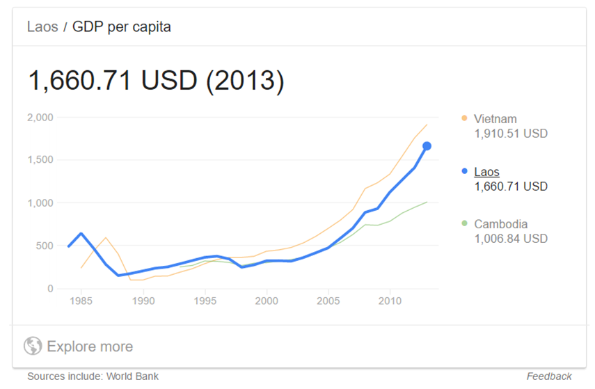 라오스는 ASEAN 국가들의 모임인 아세안 그룹에서도 가난한 국가그룹에 속해있다. 하지만, 라오스의 성장속도에 가속이 붙고 있다. 2010년대들어 세계의 공장으로 떠오르고 있는 베트남과 비슷한 속도로 성장을 거듭하고 있다. 여기에 동남아시아의 강국 태국까지 더하면, 동남아시아 4개국의 성장속도는 가히 파격적이다.