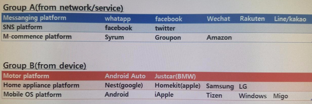아래의 테이블은 필자가 분류한 새로운 플랫폼들의 전쟁을 위해 기초자료로서 활용될 자료이다. 플랫폼전략은 기본적으로 서비스기업과 제조기업은 달라야 한다.