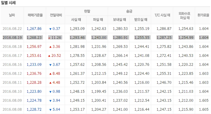 2016.08.19일 종가기준 KRW =USD는 1$=1120원이며, EUR=KRW는 없다.