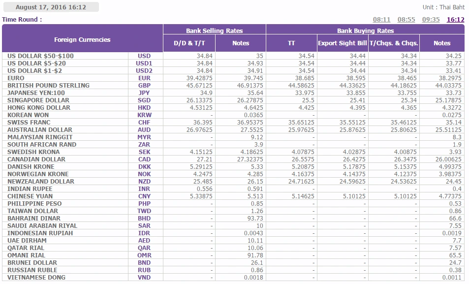 미국달러로 교환했을 시, USD300 * 34.84 = 10,452바트를 교환하지만,