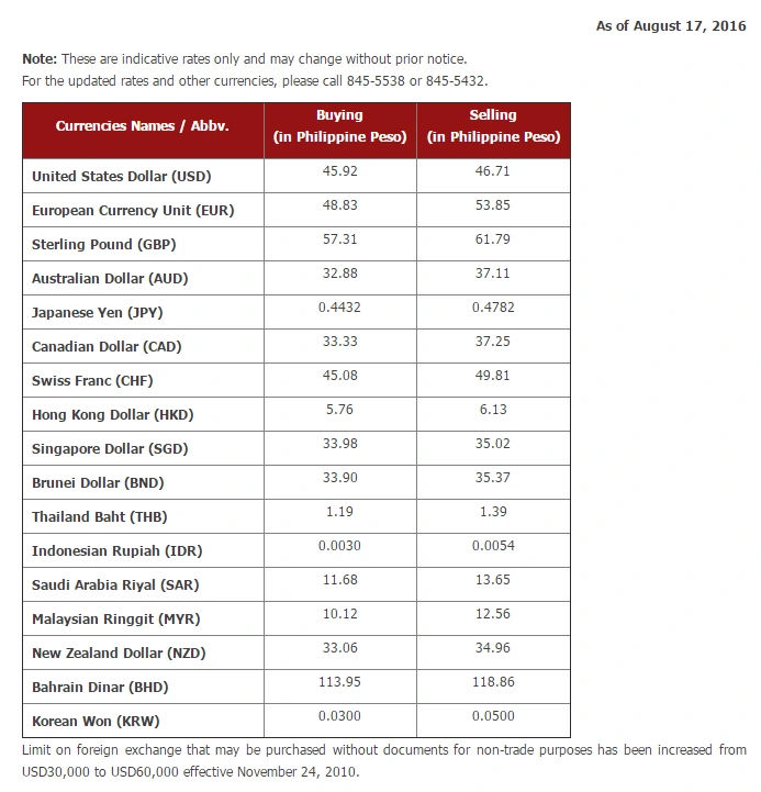 2016.08.18일 종가기준 PHP=USD는 1$=45.92peso이다.