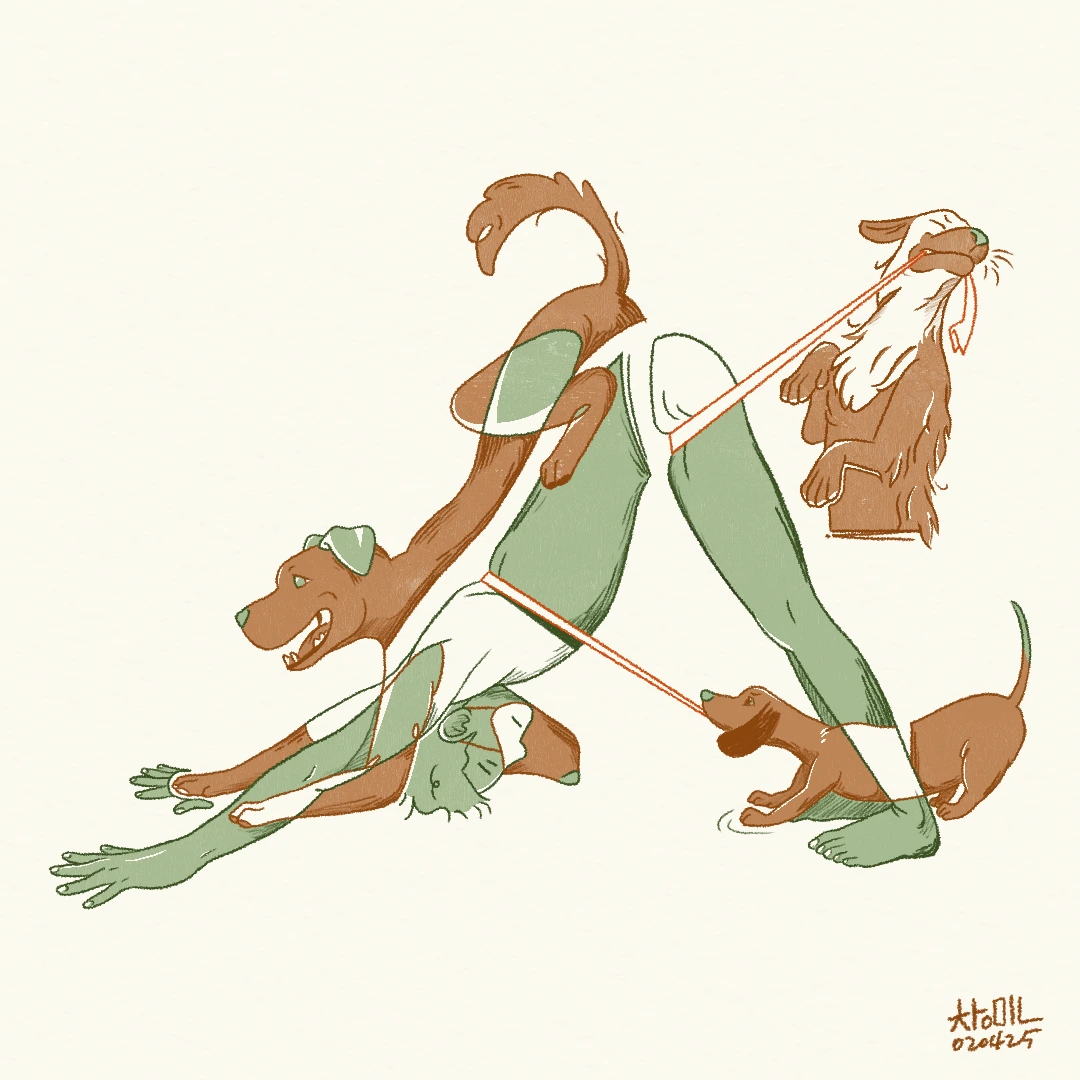 아이들이 걸을 때 힘차게 뻗어내는 다리 근육과 발바닥 젤리(육구)를 보고 있으면 땅을 밀어내는 힘찬 저항력이 내 손바닥 위에서도 거칠게 느껴진다. 그 힘으로 걸을 때 생겨나는 작은 흙먼지와 발톱으로 땅을 긁으며 내는 소리도 듣는다. 착- 착-. 그러면 나는 이 아이들의 생명력과 여전히 남아있는 야생성에 감탄한다.