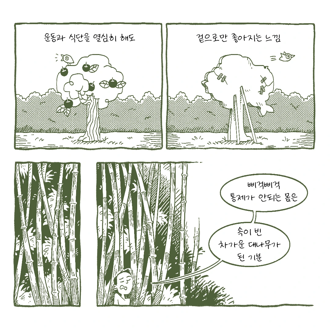 나는 꽃가루 알레르기가 있다는 사실도 잊어버리고 매년 봄이 오면 분위기에 취하다가 콧물, 재채기, 안구 가려움으로 고생을 한다. 그런 것처럼, 내가 정말 원하는 것을 잊은 채로 사진 속 멋진 몸들에 취해 헬스를 다시 했다. 이후 몸으로 직접 불편함을 호소하고 나면 그제야 다시 상기하곤 하는데, 모지리 같았다.