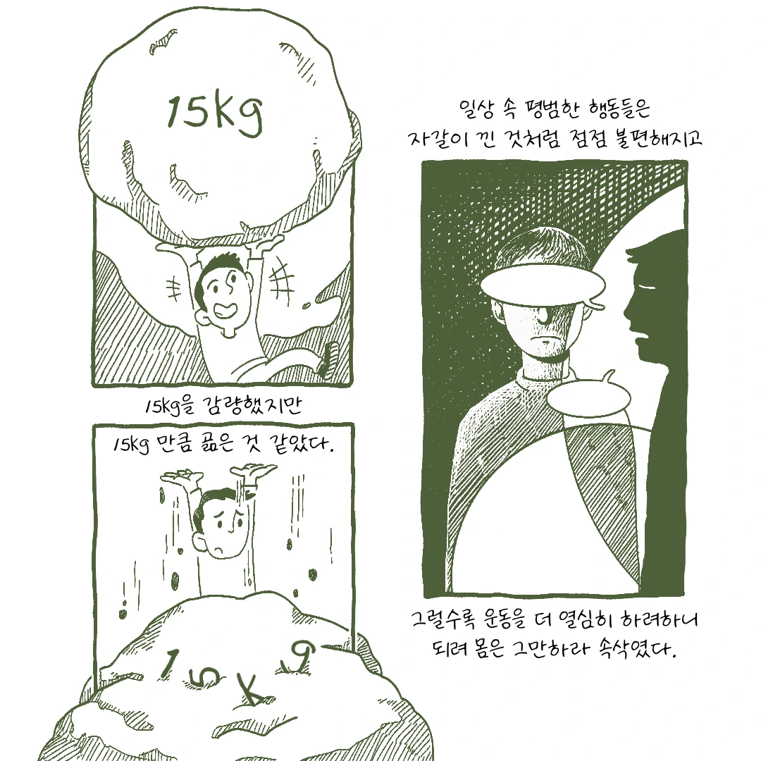 흰색으로 ‘엘파마’라고 적힌 검은 자전거를 타고 출퇴근하던 시절에도 나는 다이어트를 하고 있었다. 매일 저녁이면 다음 날 점심에 먹을 식단 도시락을 만들고, 일하는 틈틈이 사장님 눈치를 보면서 공장을 헬스장 마냥 기계들에 매달리거나 투박한 쇳덩이를 들었다 놓으며 여러 가지 운동들을 흉내 냈다. 효과가 나름 만족스러웠다. 헬스로 만들어진 육체미 넘치는 사진들을 뜨거운 시선으로 우러러보며 의욕을 다지곤 했다. “나도 꼭 저렇게 될 거야.”
