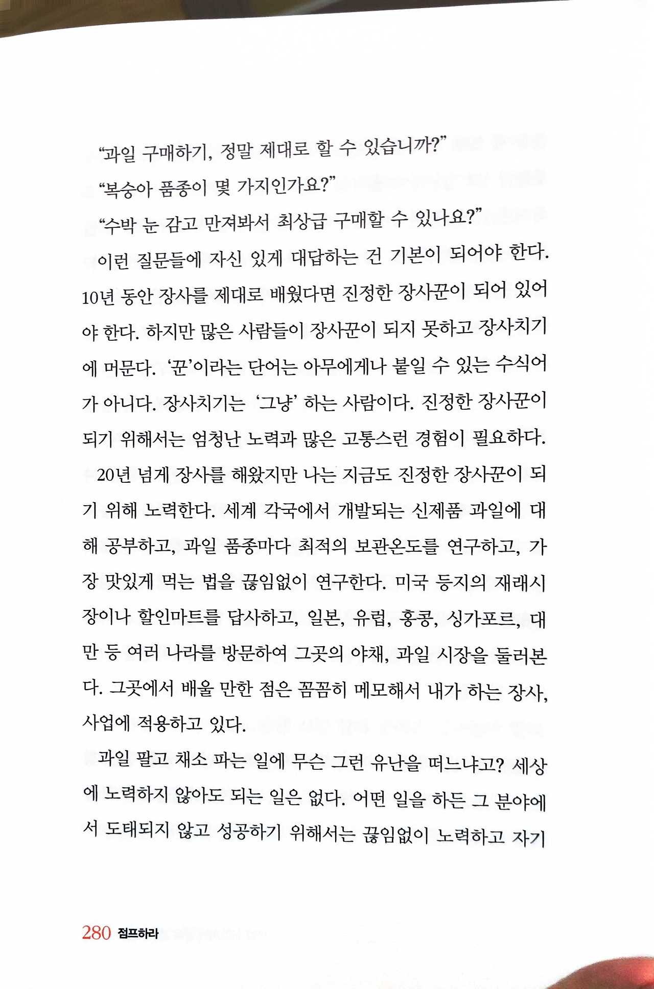 2년전에 두통쇼에 게스트로 모셔서 직접 뵜었던, 총각네 야채가게 이영석 대표의 '인생에 변명하지 마라' 책 구절을 공유합니다. 똑같은 야채, 과일 장사도 이렇게 다르게 할 수 있구나를 깨닫게 해 준 책이에요.