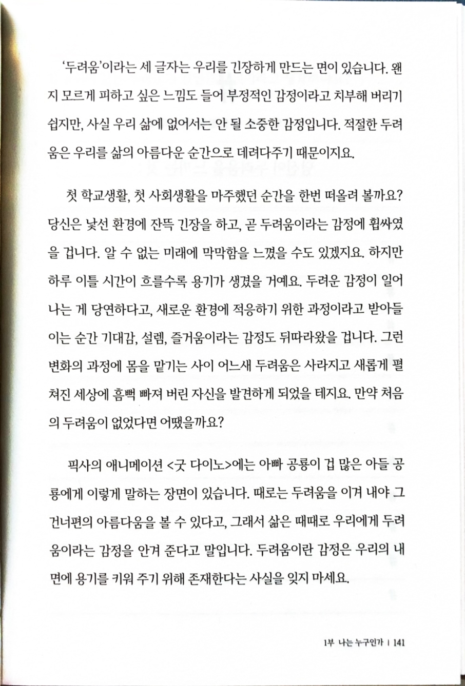 위에서 제가 말한 두려움은 약간 부정의 두려움, 책에서 말하는 두려움은 긍정의 두려움을 지칭해요.우리는 지금까지 살아오면서 긍정적 두려움을 받아들이고, 즐거웠던 기억들을 가지고 있습니다.