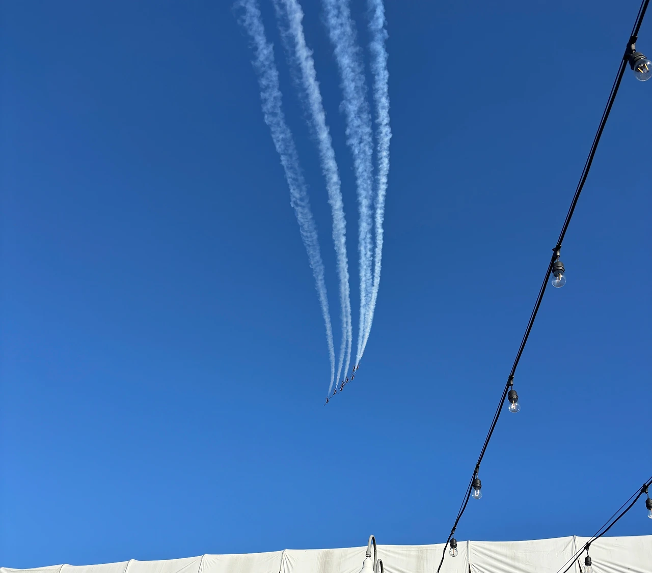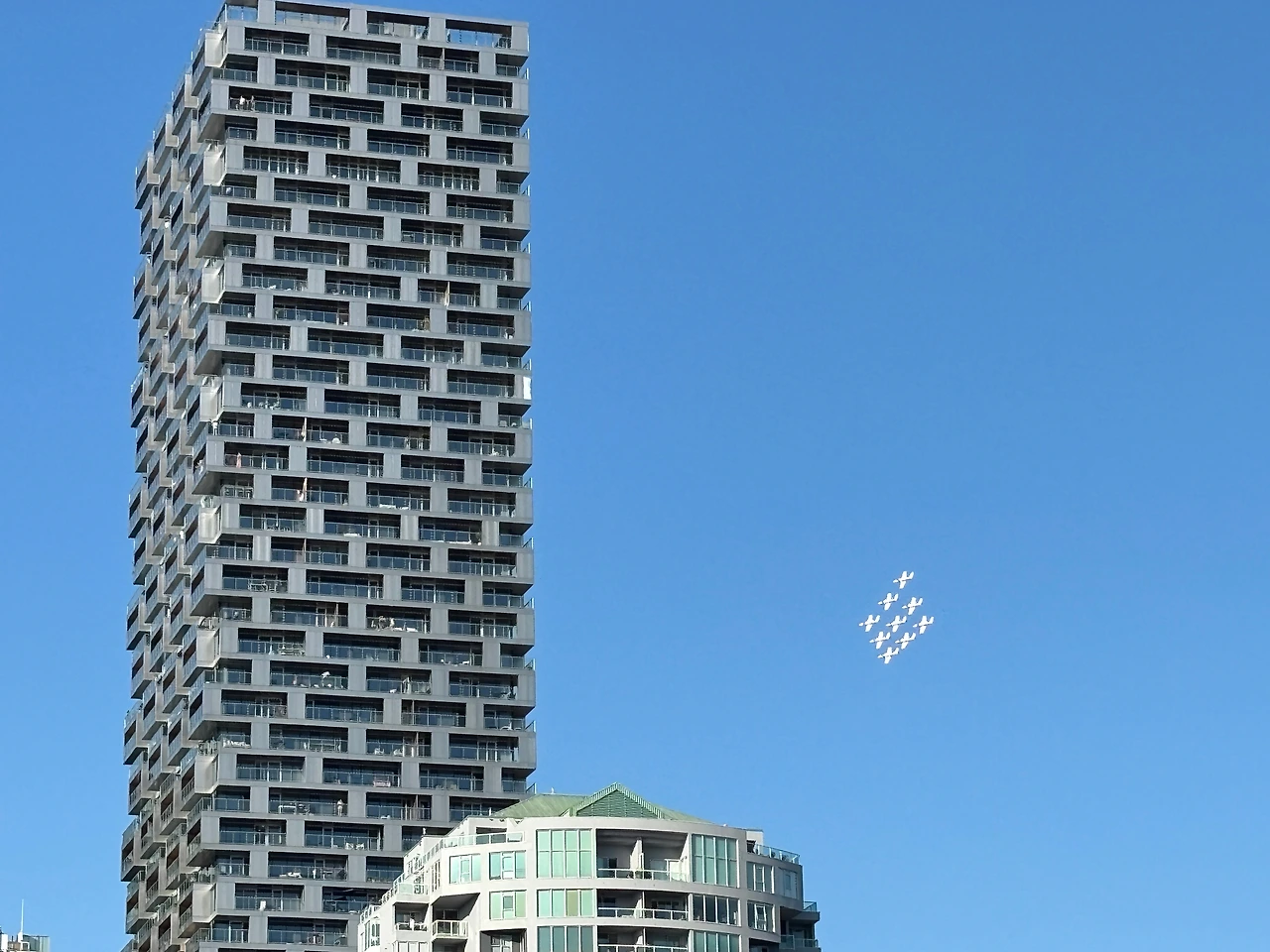 그때, 머리 위로 푸른 굉음이 지나갔다. 전투기 여러 대가 구름을 뿜어내며 편대 비행을 하고 있었다. 부두에 있던 많은 사람들 모두가 놀란 듯이 하늘을 쳐다봤다. 아빠는 카메라를 들어 동영상을 찍고는 나에게 신나게 자랑을 했다. 전투기는 우리 머리 바로 위를 지나가 저 멀리 빌딩 뒤까지 빠르게 날아갔다.