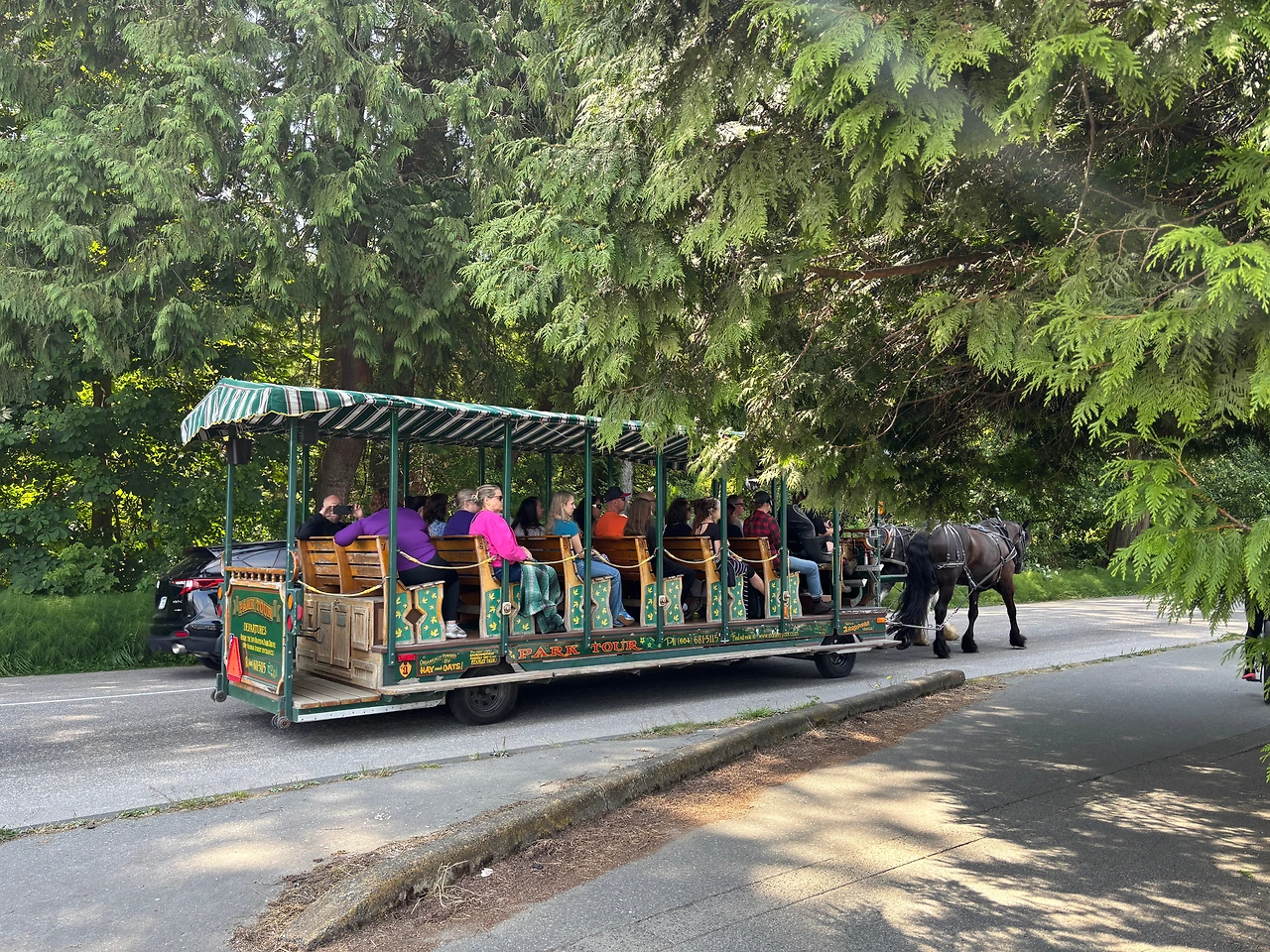 스탠리 파크 초입에서는 마차를 볼 수 있었다. 짙은 고동색의 말 한 마리가 빠르지도 느리지도 않은 속도로 또각거리며 사람들을 한가득 태운 마차를 끌고 있었다. 내 앞에 있던 여자는 마차를 찍다가 자전거를 미끄러뜨리기도 했다.
