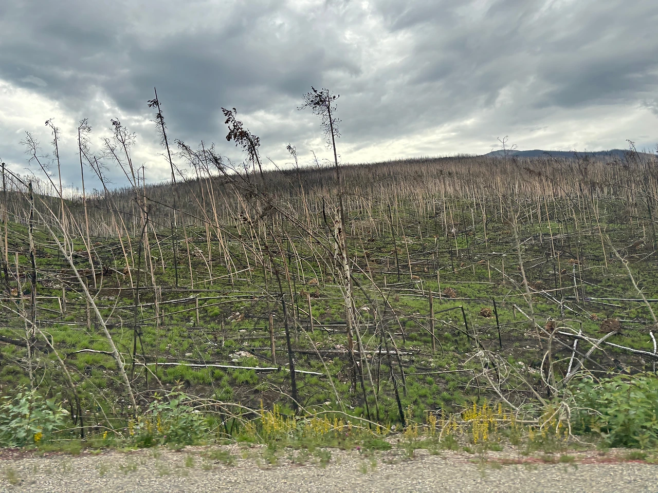 새벽 공기에 차가워진 차 시트에 몸을 기대어 재스퍼의 풍경을 바라본다. 아까 재스퍼 입구에서 팜플렛을 나눠주며 미소를 건네던 톨게이트 직원과는 상반되는 모습이다. 재스퍼의 첫인상은 앙상하기 그지없었다. 작년 산불로 홀라당 타버린 나무들이 철근처럼 앙상하게 뒤틀려 있었다.