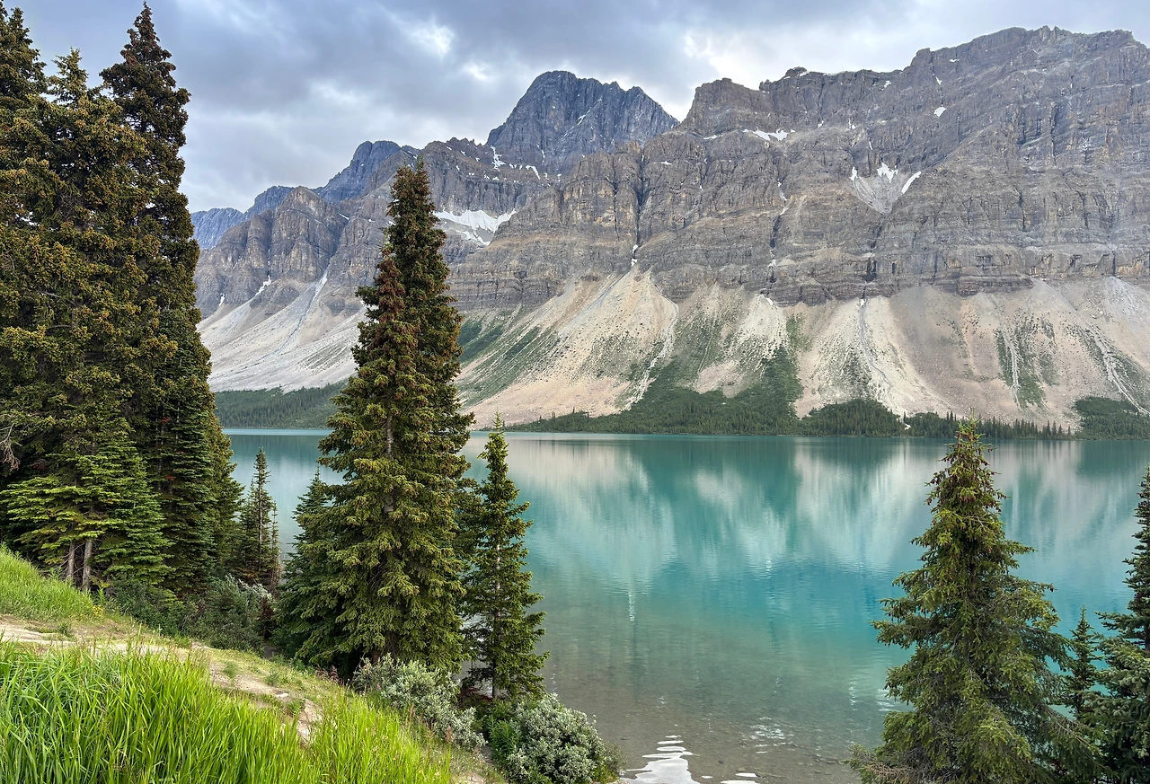저녁 즈음 바우 호수(Bow Lake)를 잠시 들렀을 때도, 운 좋게 날씨가 맑게 갠 덕에 호수의 푸른 물빛을 볼 수 있었다. 멀리서 봤을 때는 터키석 빛깔의 거울 같았지만, 호숫가로 내려가 물에 손을 담가봤을 때는 차갑게 녹은 유리를 만지는 것처럼 투명했다.