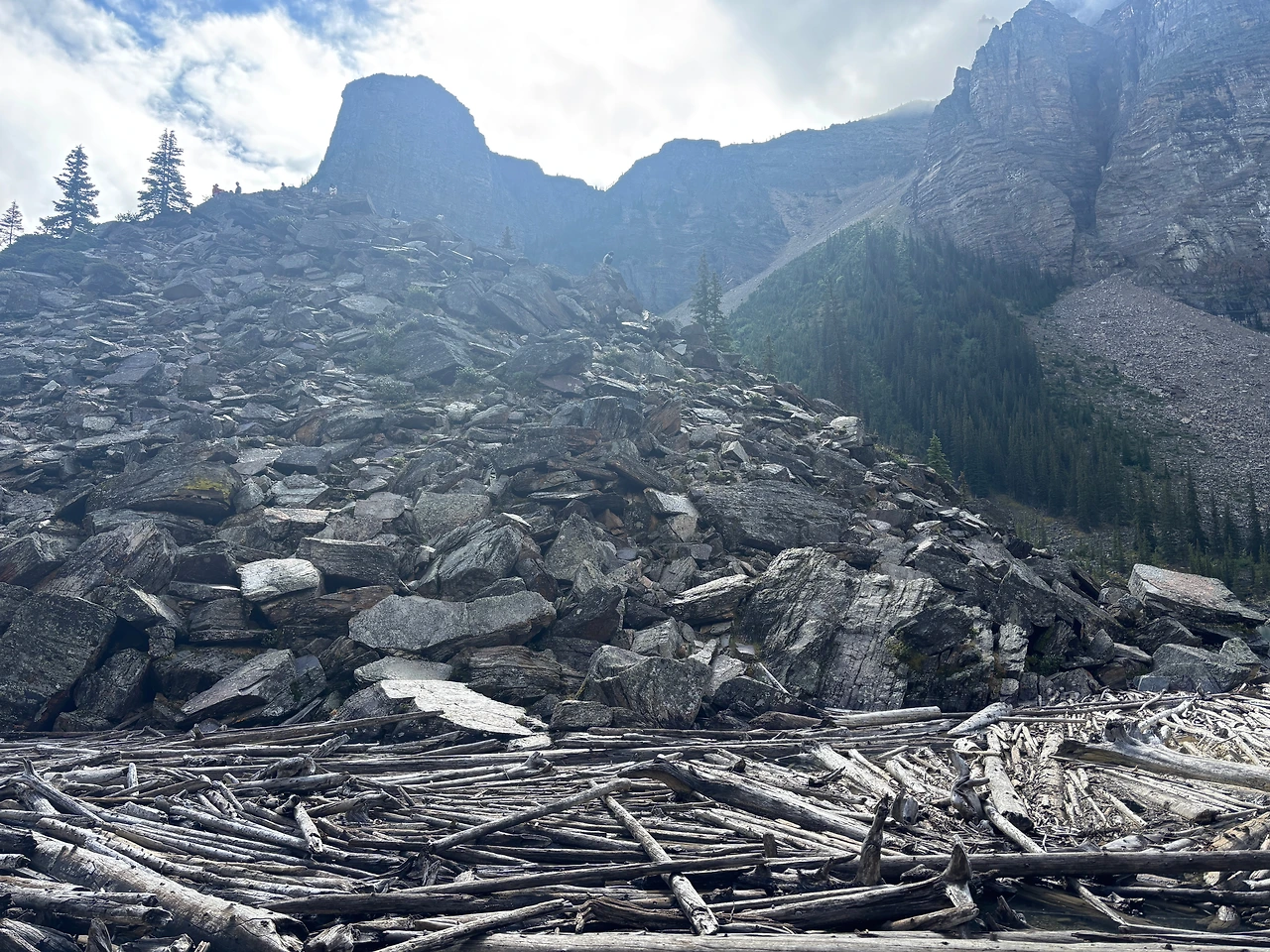 호숫가 한쪽에는 돌더미와 부러진 나뭇가지들이 한가득 쌓여있었다. 산사태라도 났나 싶었지만 사실 이건 빙하의 흔적이었다. '모레인 호수'라는 이름에서 그 힌트를 찾을 수 있는데, 모레인(moraine)이라는 단어 자체가 '빙하가 골짜기를 깎으면서 운반해 온 암석 조각들의 무더기'를 의미한다고 한다.