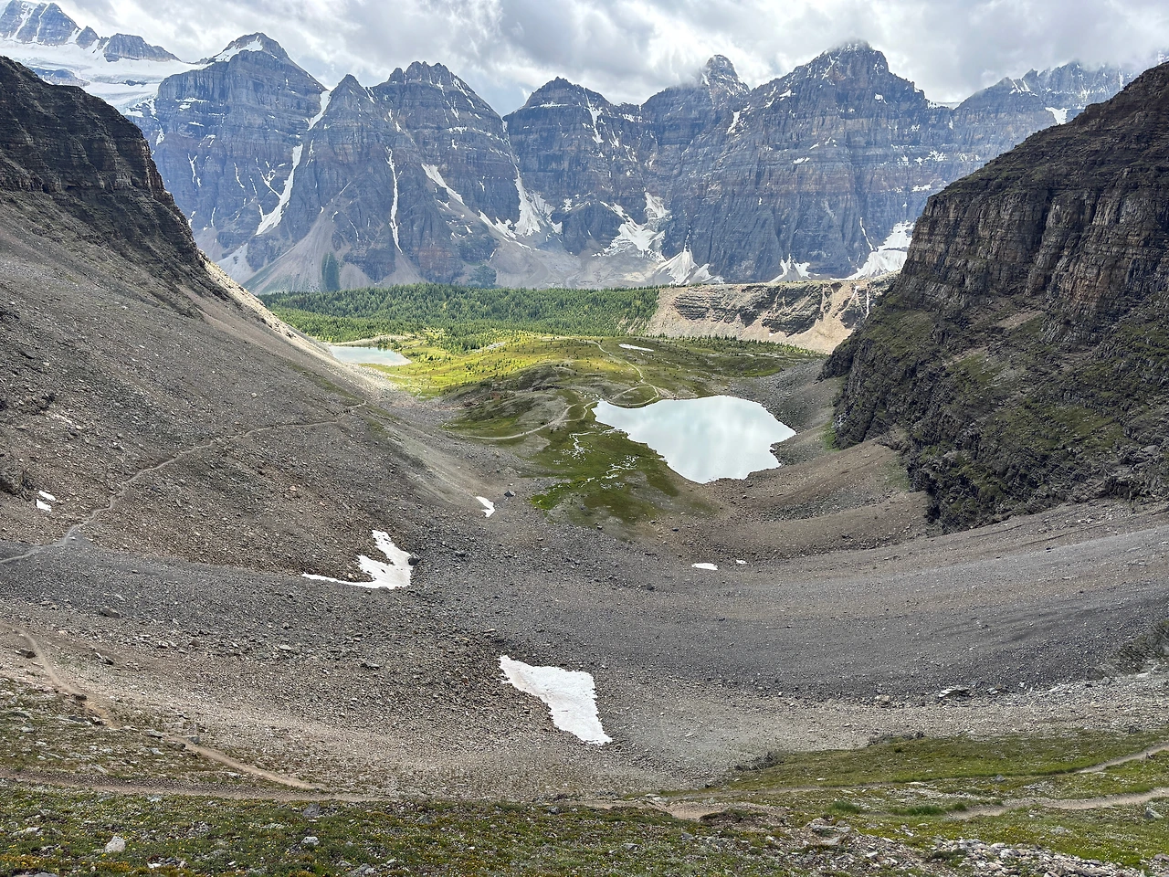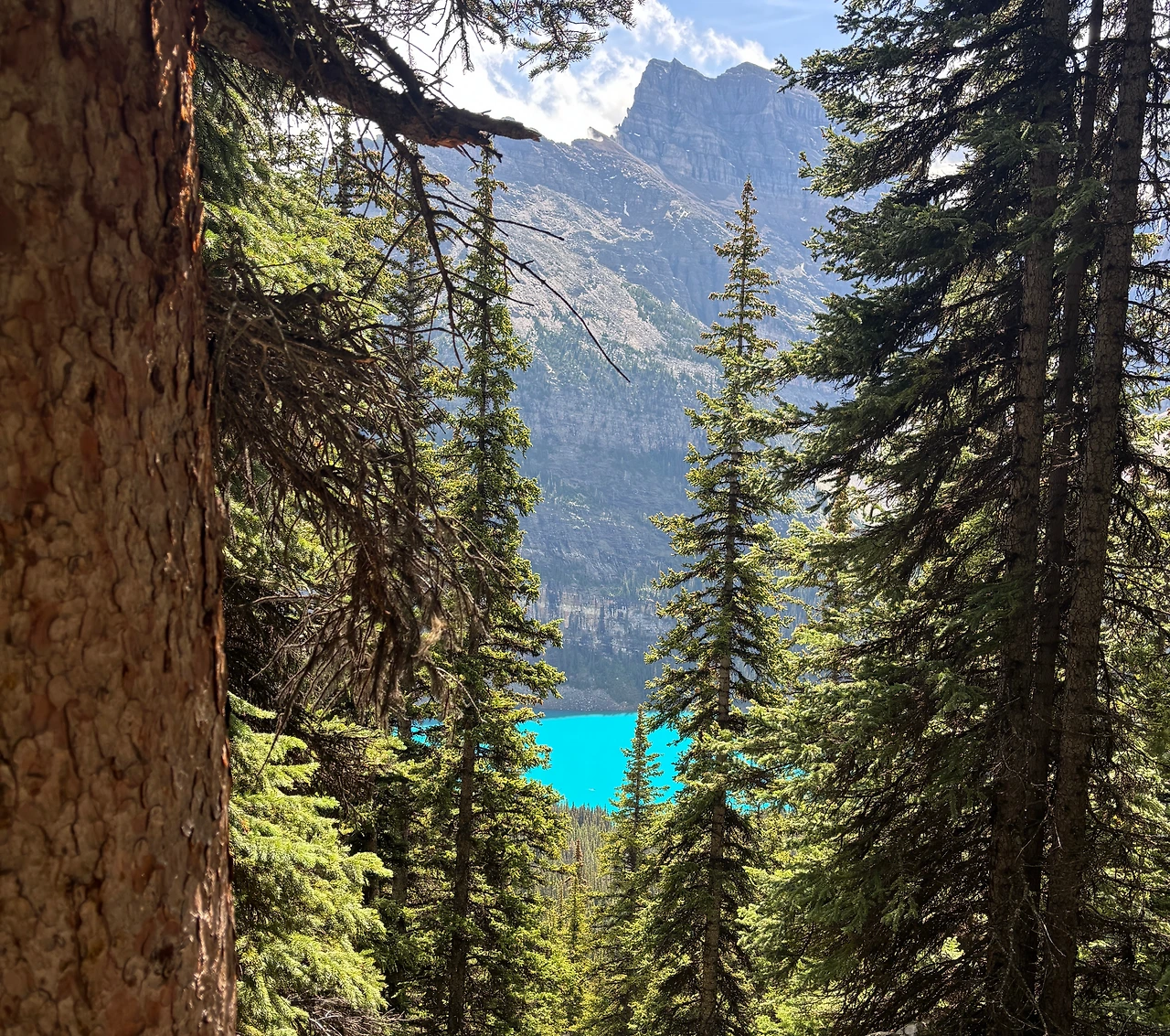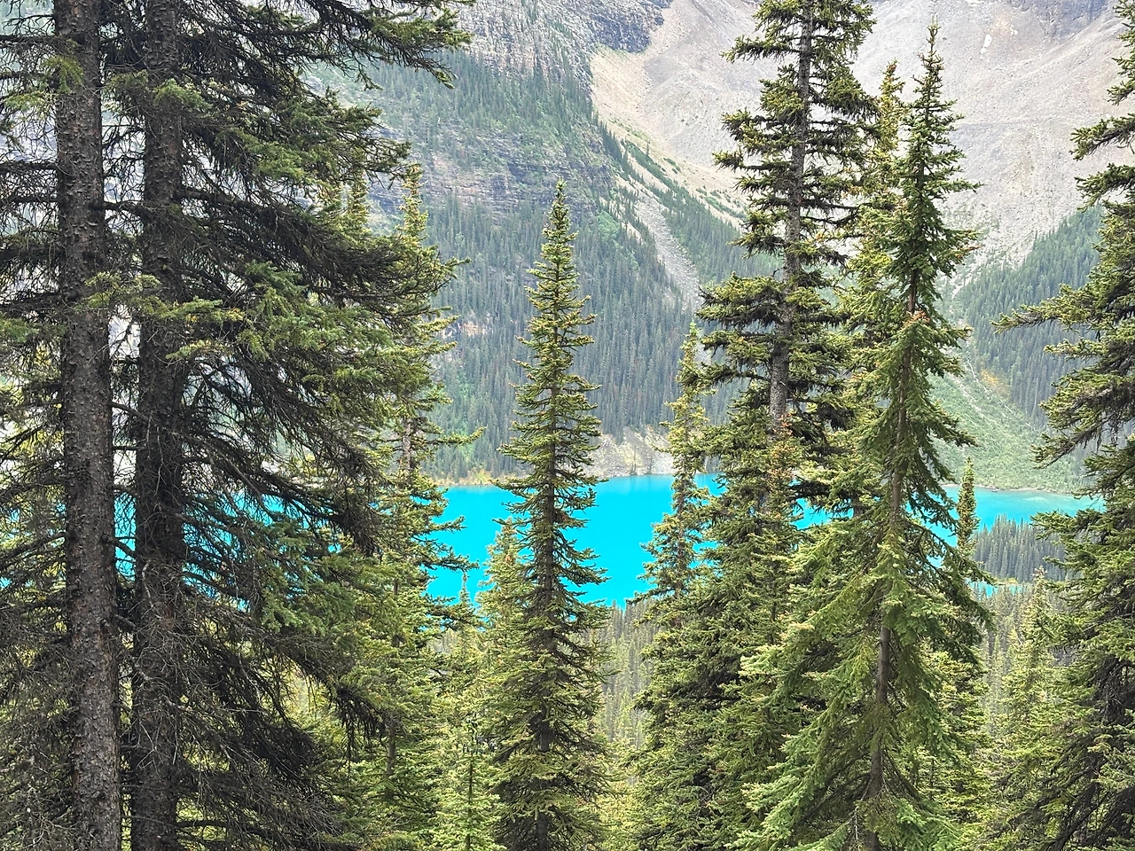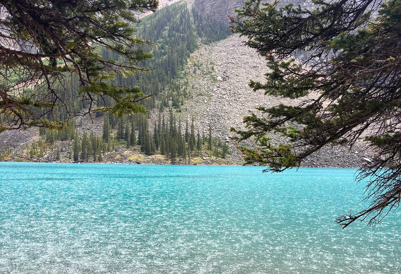 길은 빗길에 미끄러웠지만, 올라왔던 시간에 비하면 내려가는 건 금방이었다. 산길을 거의 다 내려왔을 즘엔, 나무 사이로 모습을 살짝 드러낸 모레인 호수를 다시 볼 수 있었다. 비가 와서 물빛이 흐릴 것 같다던 모두의 예상을 깨고 모레인 호수는 아까의 신비한 물빛을 어김없이 내보였다.