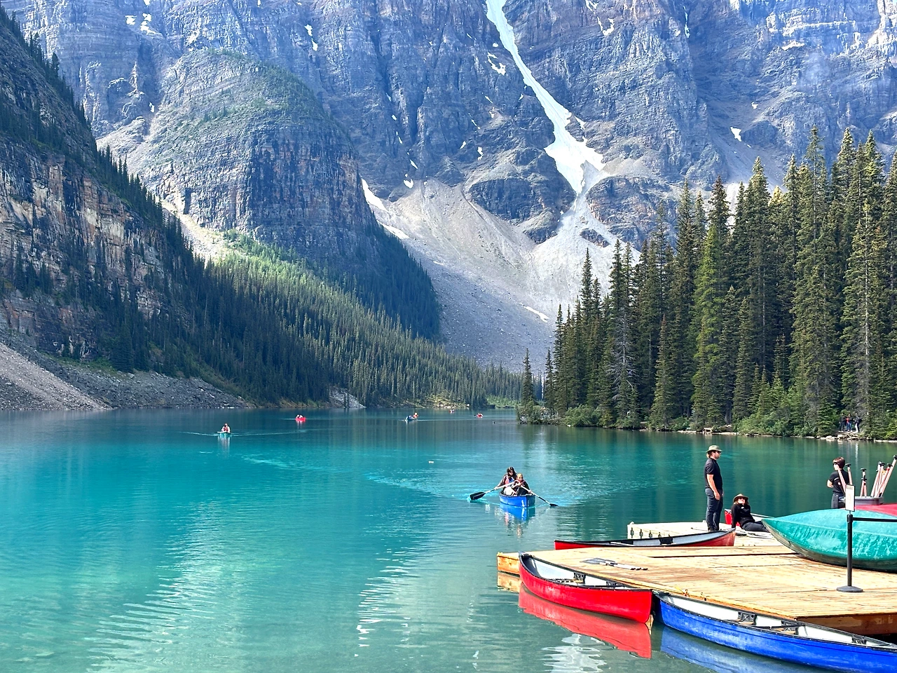 이토록 추운 날씨에도 사람들은 카누를 타고 있었다. 비가 와 텅 비어있던 레이크 루이스를 떠올려 보면, 카누도 호수에 무늬를 만들며 하나의 풍경을 더하는 듯하다. 그리고 밴프의 호수가 대개 그러하듯이, 호숫가는 어김없이 침엽수로 둘러싸여 있고, 호수 건너편에는 빙하가 얽혀있는 커다란 산맥이 우뚝 솟아있다. 내가 마주했던 모레인 호수의 첫인상은 다음과 같다.