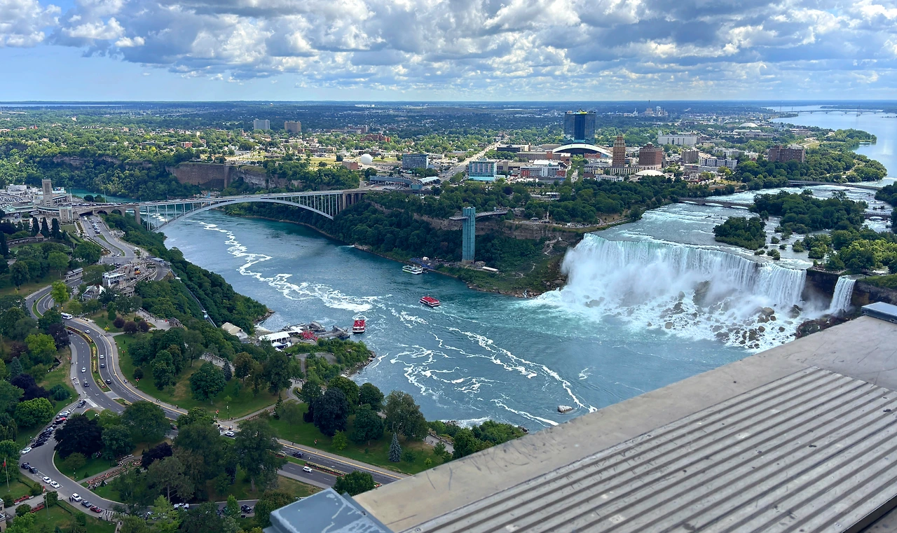 우리는 직원의 안내를 받아 엘리베이터를 타고 전망대로 올라갔다. 스카이론 타워 외벽을 따라 노란색 엘리베이터가 올라가자, 나이아가라 폭포의 전경이 서서히 드러나기 시작했다.