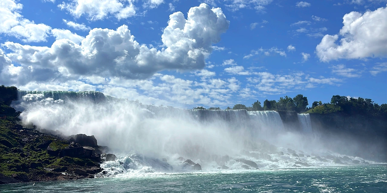 미국 쪽에 위치한 '아메리칸 폭포' 옆을 먼저 지나간다. 푸른 하늘에 걸린 구름과 폭포가 만들어내는 물보라가 분간이 안될 정도다. 그간 높은 폭포는 많이 봤어도, 이렇게 광활한 폭포는 처음이다.