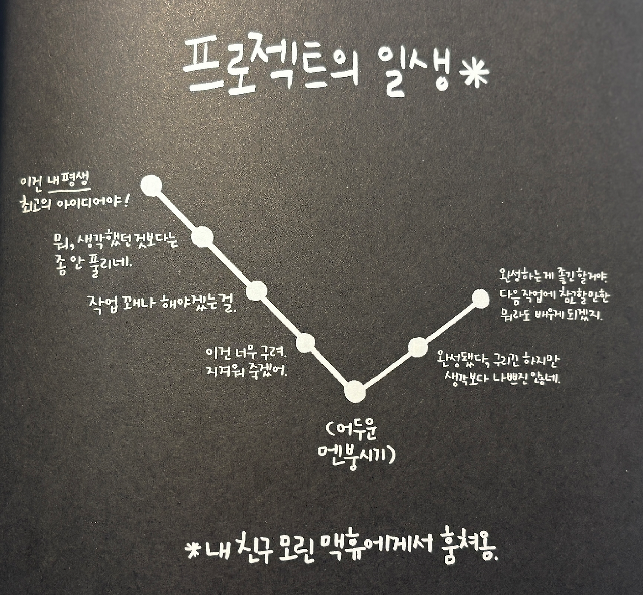 그래도 써놓고 보니 나쁘지 않은 것 같다. 『훔쳐라, 아티스트처럼』에 나온 '프로젝트의 일생'을 보자. 실제로 나의 브런치북 프로젝트가 그러했다.