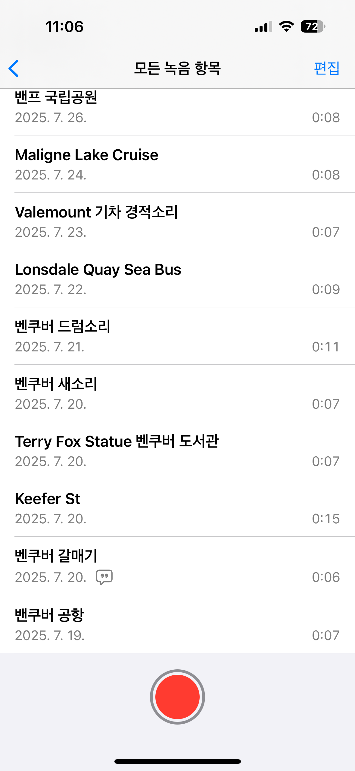 여행지에서 소리도 담아보았다. 밴쿠버의 시버스 안에서, 베일마운트에서 들었던 기차 경적소리, 캘거리에서 트램 움직이는 소리, 모레인 호수 트레킹에서 우박 떨어지는 소리 등등...