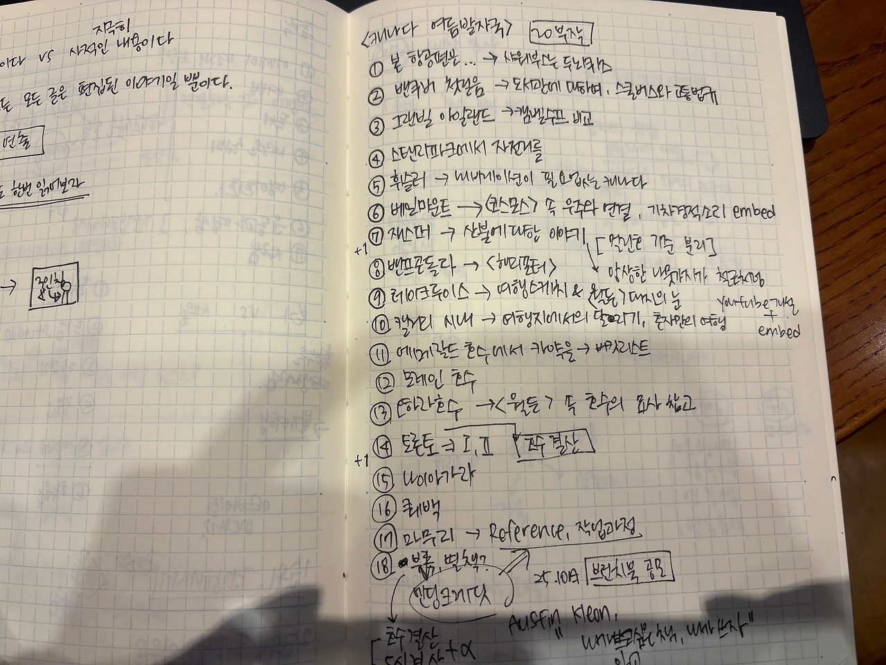 틈날 때마다 개요를 보면서 에피소드별로 생각나는 아이디어도 군데군데 적어두었다. 대학에서 배운 글쓰기 수업을 실제로 적용하고 있는 나를 보면서 신기하기도 했다. 그때는 개요 작성하는 게 그냥 과제에 불과했는데 말이다.