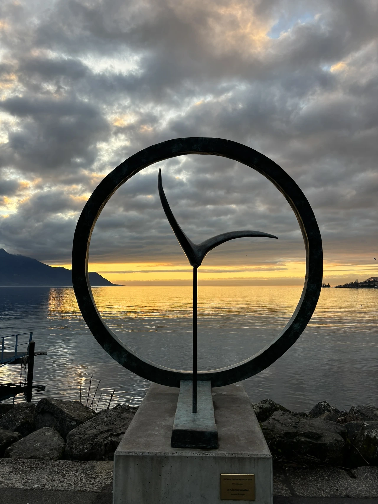 레만 호에 노을이 내려 앉기 시작할 즈음, 프레디 머큐리 동상이 저 멀리 보이기 시작했다. 하늘 높이 팔을 치켜 세운 머큐리 동상에 노을빛이 은은하게 감돌았다.