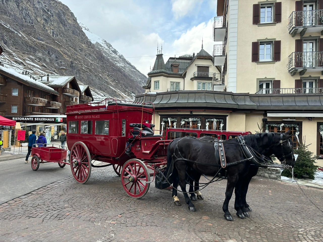 검은 말이 끄는 짙붉은 마차가 모습을 드러냈다. 지금도 체르마트 하면 떠오르는 클래식한 이미지, 그러니까 어떤 종류의 고풍스러운 인상은 여행의 첫 장면이었던 한 마차에서 비롯되었다. 립스틱 같은 짙붉은 색의 마차와 그와 대비되는 흑색의 말은 단숨에 마을에 신비감을 불어넣었다.