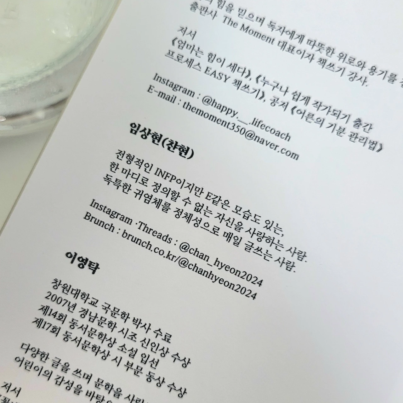나는 왜 글을 쓰고 싶어 했을까? 그리고 어떤 글을 쓰고 싶을까? 공저를 하면서 내 색과 방향을 찾아가고 있었다. 그리고 그걸 작가 소개에 녹여보기로 했다. 몇 가지 샘플을 작가님들과 공유하고 그중에 가장 괜찮은 걸로 골라 싣기로 했다. 그렇게 최종 결정한 작가 소개가 바로!