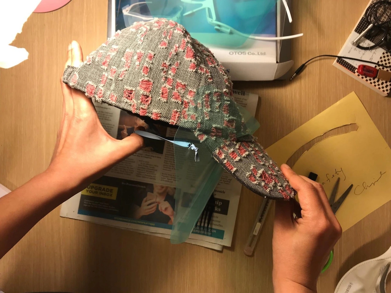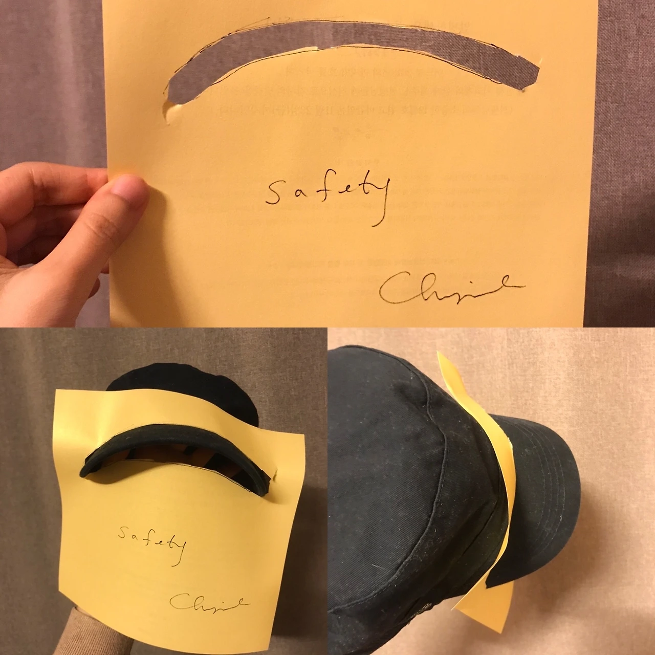 1 base-ball cap (or anything fits your head) , transparent plastic sheet (for example, from coke bottle) , a cutting tool and a pen