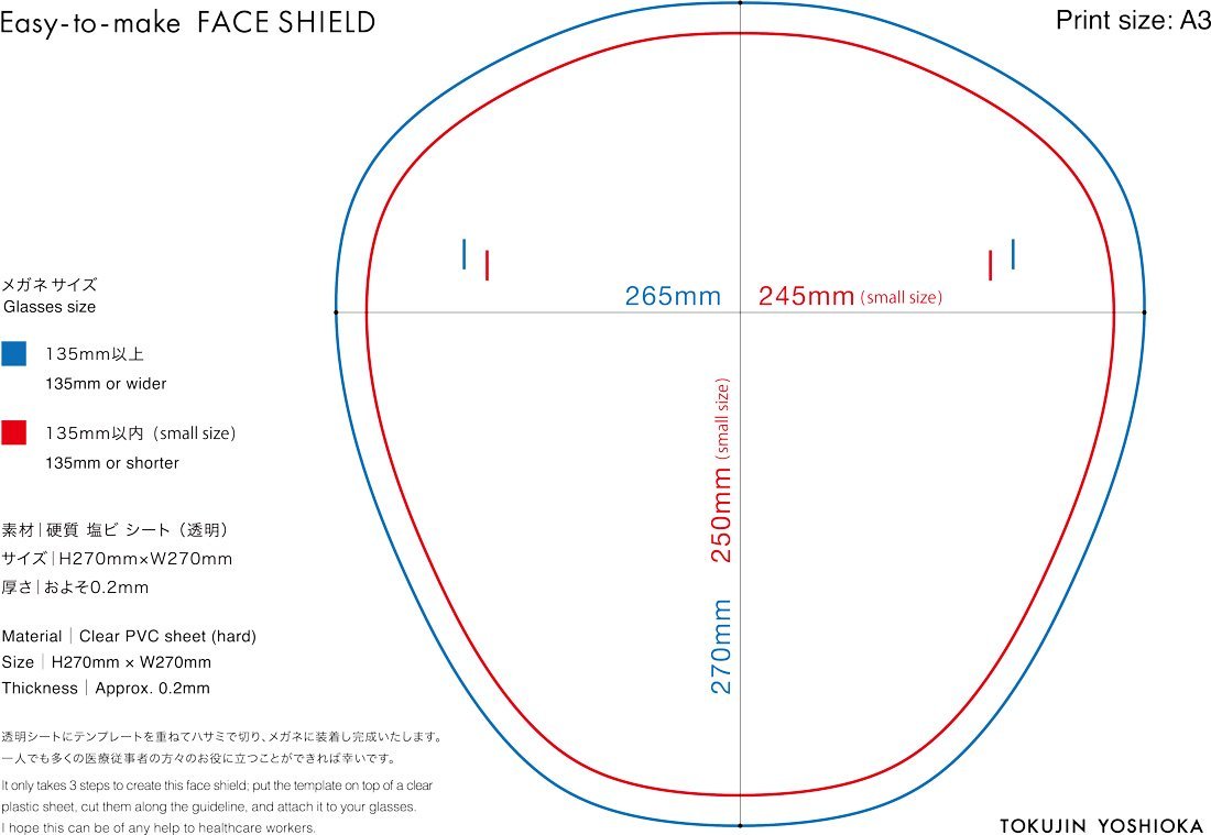 두가지 싸이즈로 제안 되어 큰얼굴(?), 작은얼굴에 맞추어 자를 수 있고, 안경 다리를 삽입할 부분에 홈을 파는 커팅 기구만 있으면 깔끔한 쉴드가 완성 될 수 있겠네요.