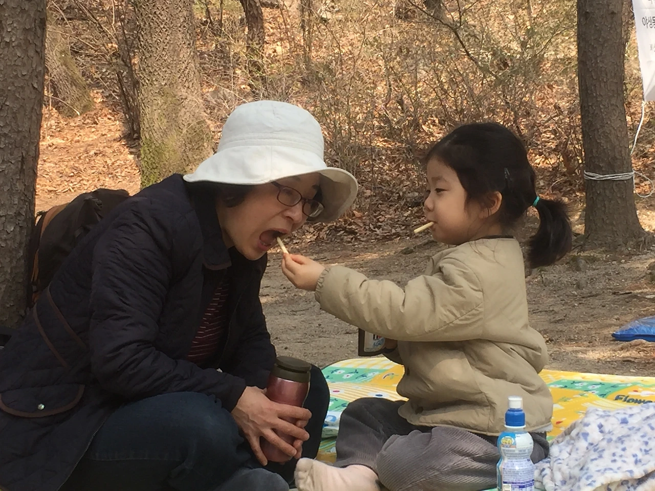 아이는 다시 돗자리로 돌아갔다. 잣나무 아래 너른 평지에 돗자리를 깔고서야 그 이유를 알았다. ‘할머니 가방 줘봐.’ 가방을 열더니 잽싸게 막대 초콜릿을 꺼냈다. 얼굴이 양지꽃처럼 환해졌다. ‘할머니 이거 먹어.’ 너그러워지기도 했다. 몇 개 먹더니 양말 신은 채 흙바닥에서 뛰어다닌다. ‘춤? 이렇게 췄어?’ 아이는 집터에서 우리가 연신 떠들어대던 엄마의 춤 이야기를 귀에 담아두고 있었다. 초콜릿이 더 급했을 뿐이었다.