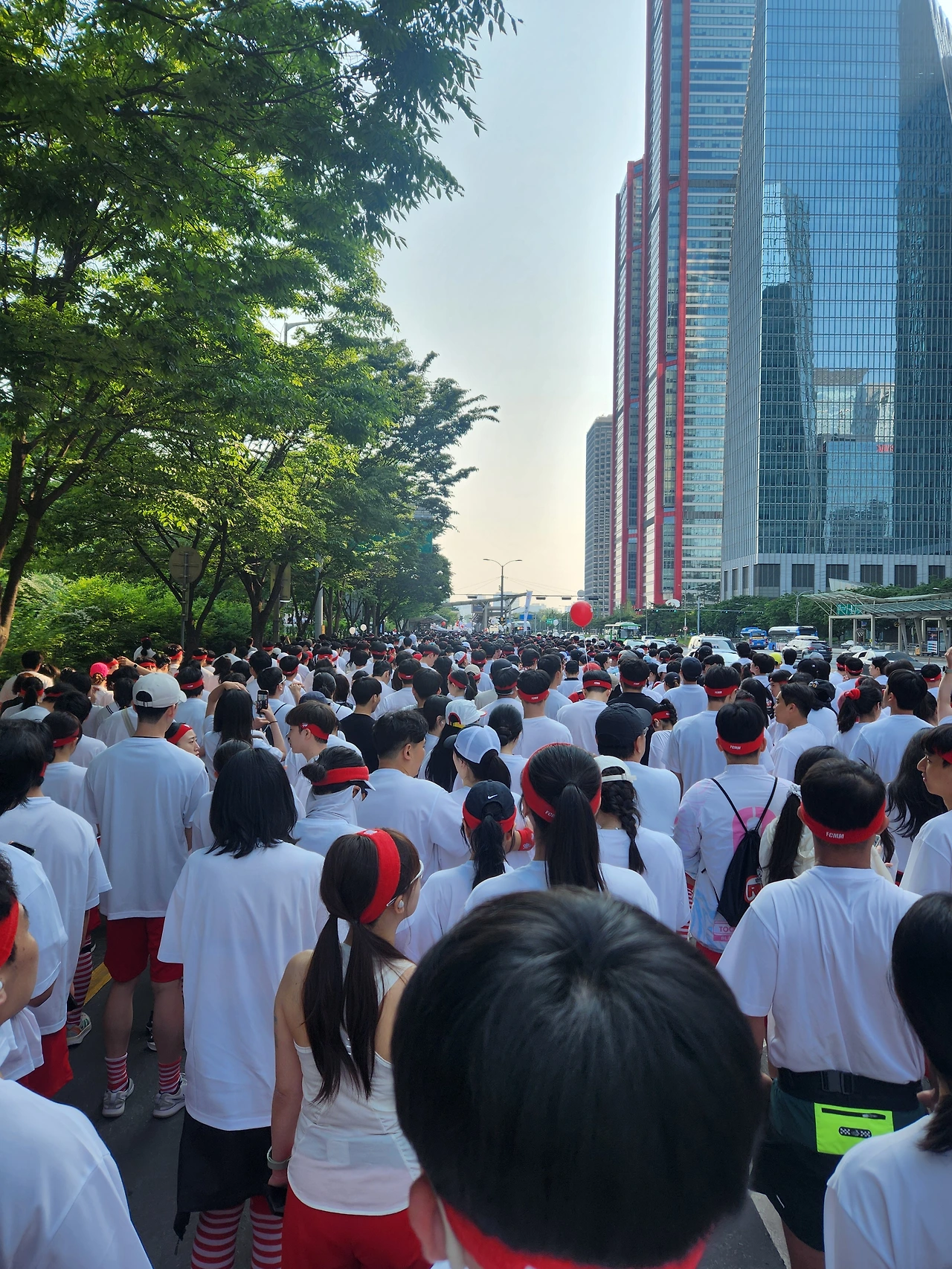 사전 기념품을 받고 일주일 뒤, 대회 당일은 생각보다 빨리 왔고 새벽같이 일어나서 여의도로 향했다. 이렇게 큰 대회를 하는 날은 집에 나서서 이동하다 보면 나와 같은 유니폼을 입은 사람들을 심심찮게 만날 수 있다. 이날은 빨간 바지와 줄무늬 양말이 반가웠었다.