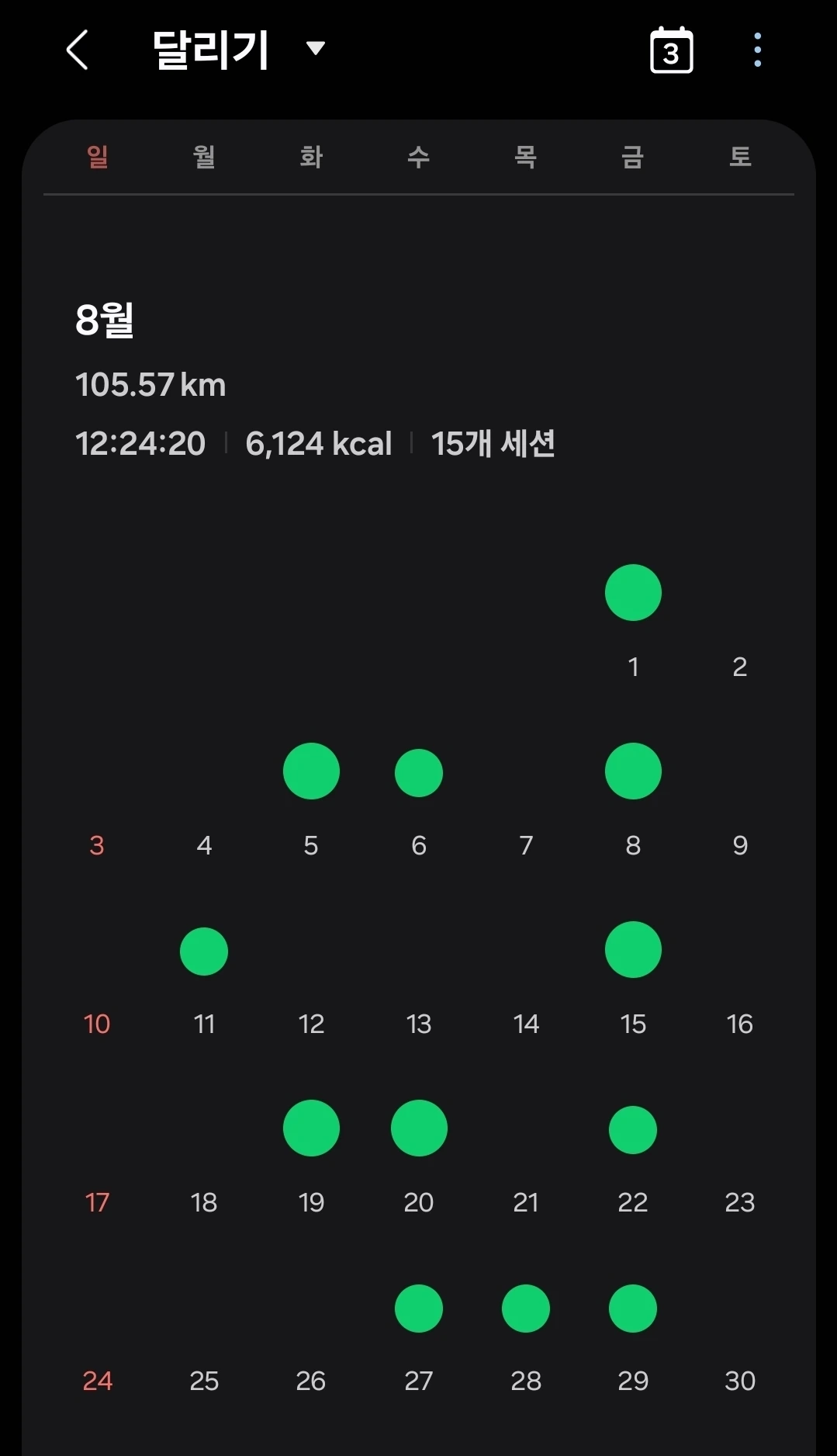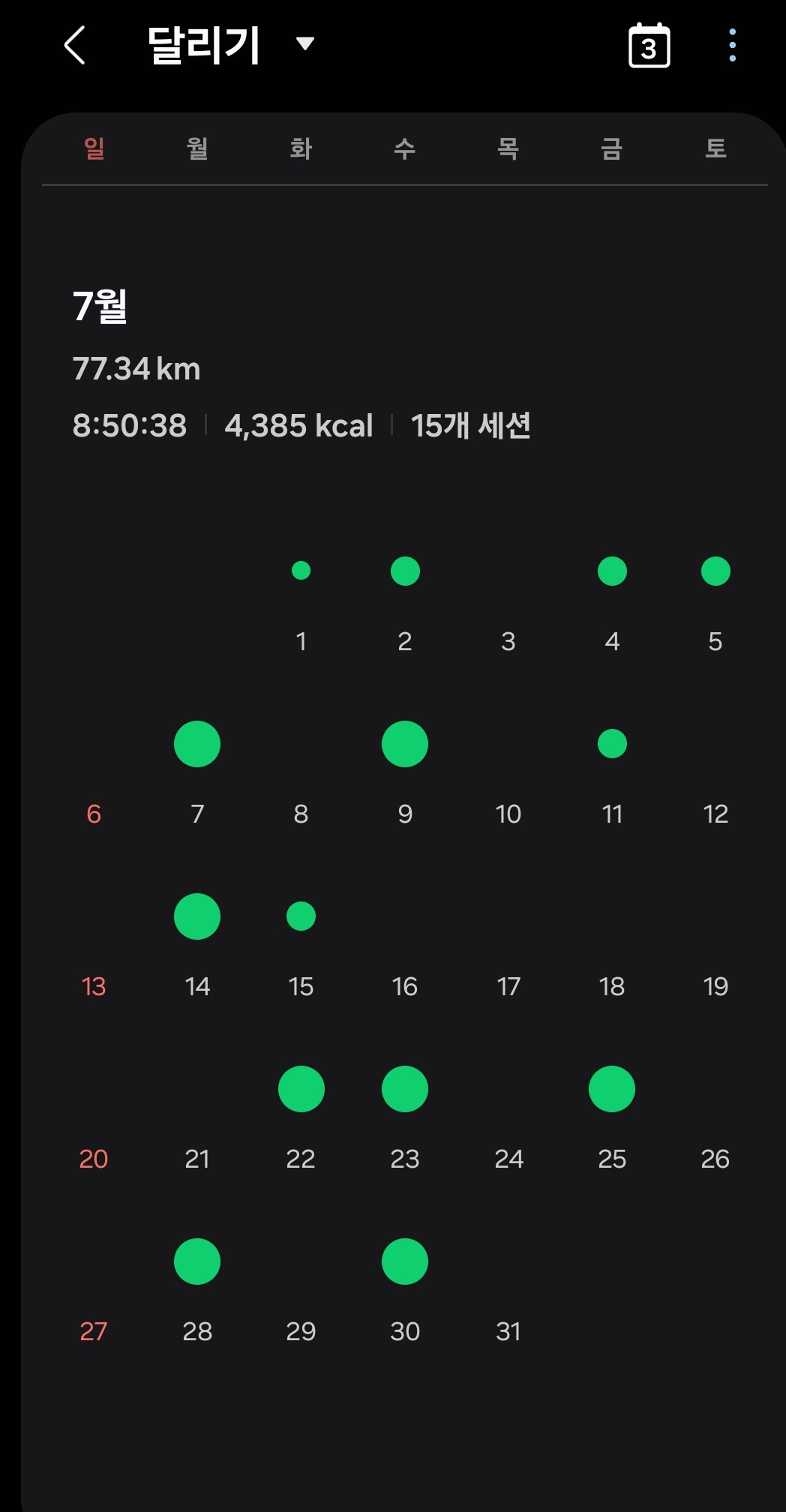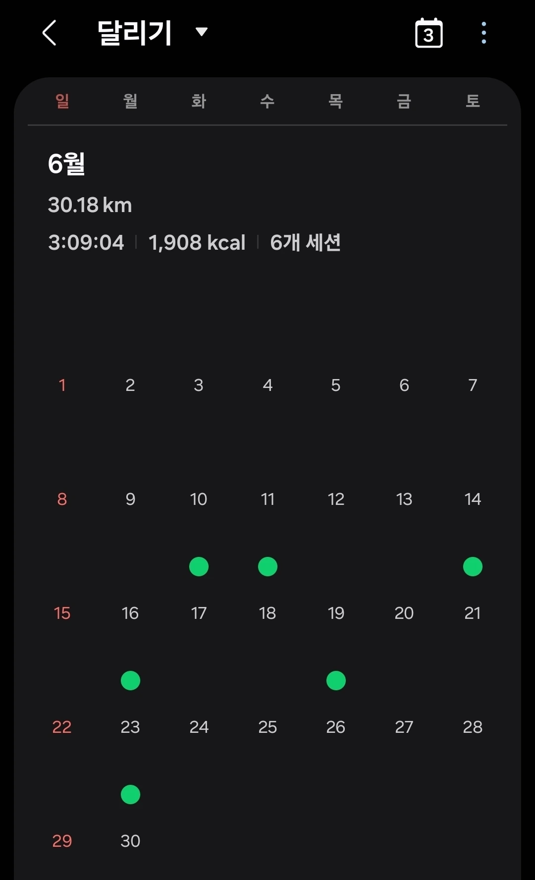 나는 뛸 때 갤럭시 워치를 사용하기 때문에 삼성헬스에 기록이 된다. 앱을 열어보니 6월은 이제 막 뛰기 시작할 무렵이었다. 그래서인지 화면에는 작고 귀여운 점 몇 개가 찍혀있다. 총마일리지는 30k 남짓. 지금 보면 이것밖에 안 했나 싶지만 저때의 나는 아침에 30분씩 뛰는 것도 꽤 힘들었었다.(지금은 안 힘들다는 게 아니다)