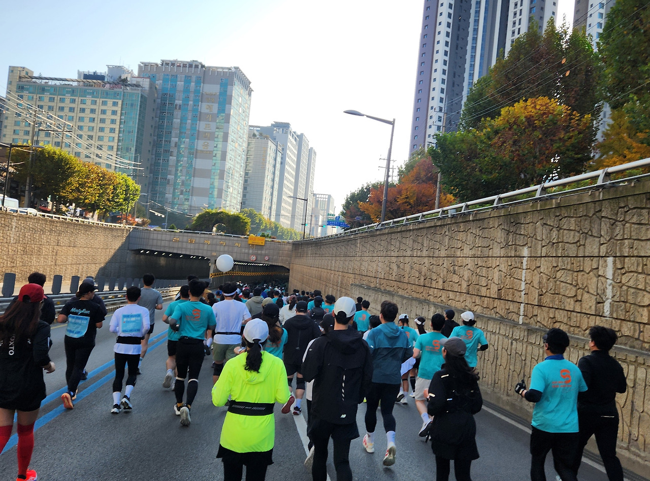 자동차로만 지나가보던 지하차도를 달려서 가는 경험은 또 어떻고 말이다. 이렇게 계속 새로운 광경이 눈앞에 펼쳐지니 힘들다는 생각이 거의 들지 않았다. 빠르진 않았지만 조금씩 조금씩 사람들을 따라잡다 보니 2시간 20분 페이스메이커까지 따라잡았다.