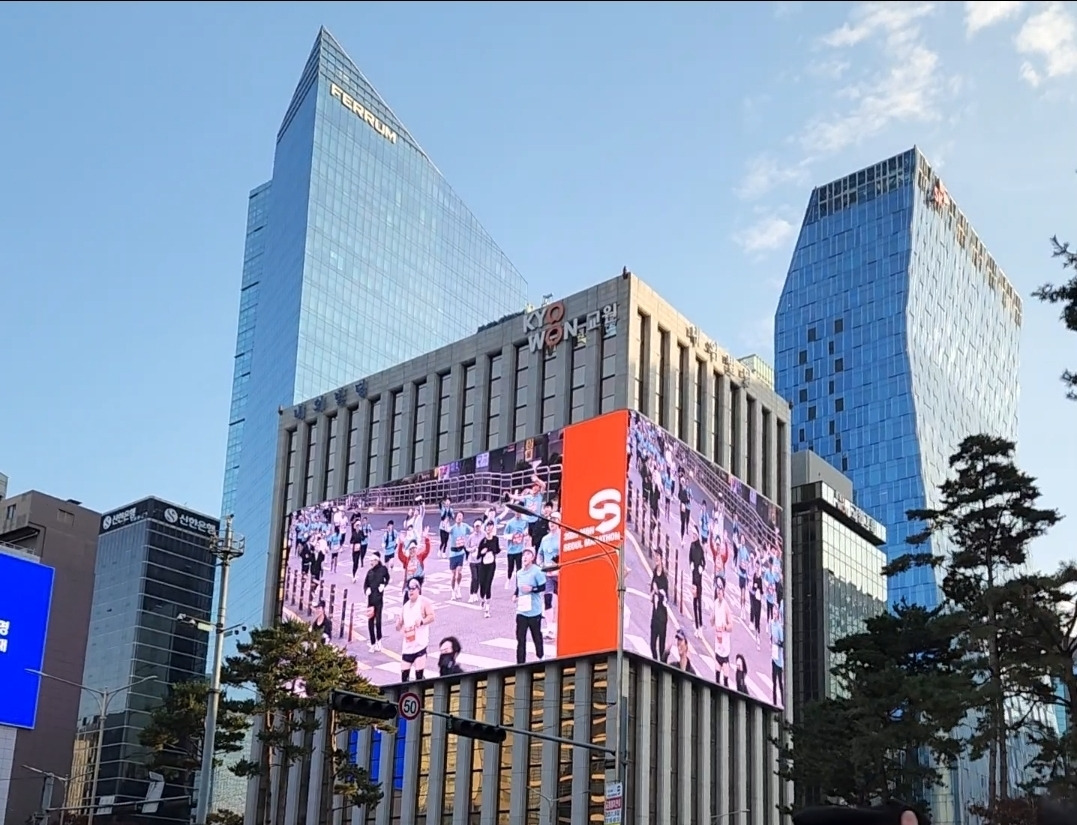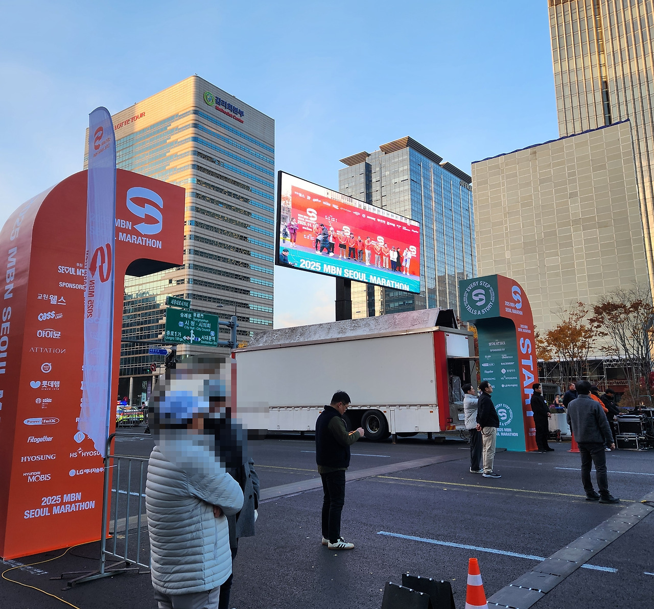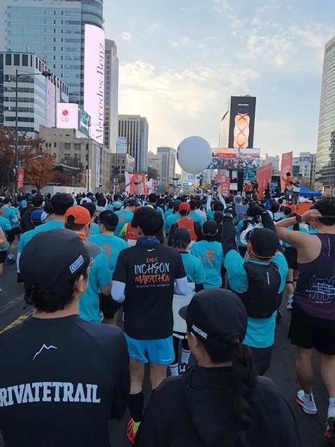 중간에 커다란 전광판에 내 얼굴이 나올 때 손을 흔들면서도 가보는 재미는 이럴 때 아니면 언제 해보나 싶다. 정말이지 마라톤 대회는 이런 소소한 재미때문에 계속 참가할 수밖에 없다.