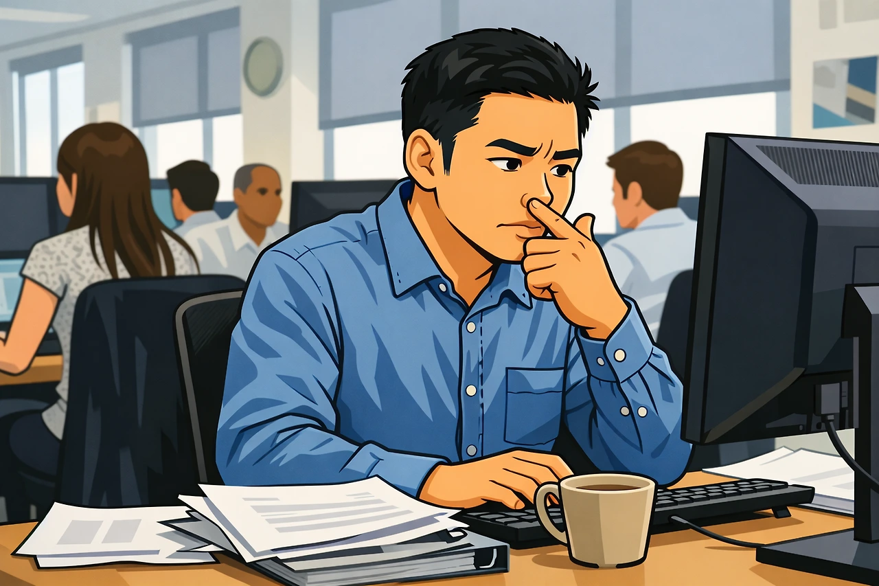 그러던 어느 날, 컴퓨터 화면만 보다가 잠깐 목이 아파 고개를 풀고 옆으로 돌렸을 때 목격하고 말았다. 그의 검지 손가락이 콧구멍 안에서 꿈틀거리고 있는 것을.