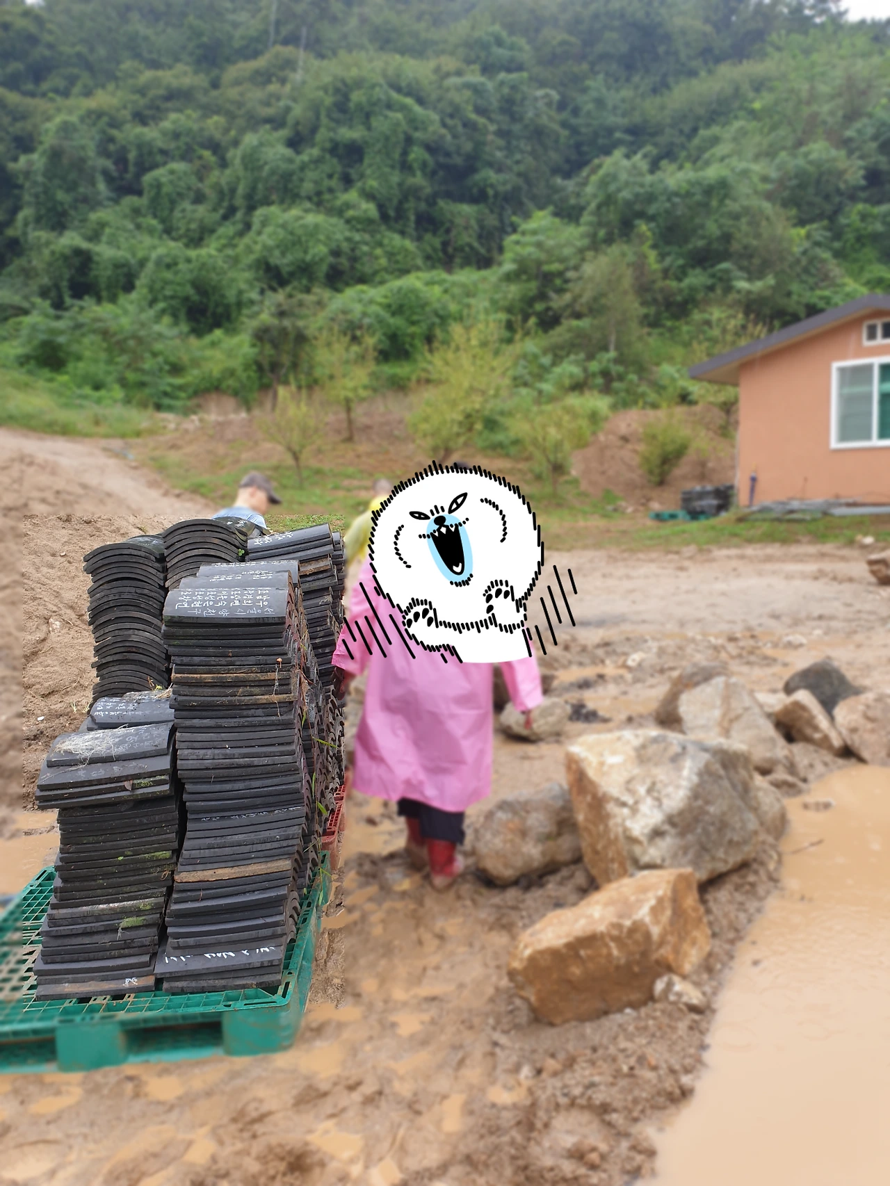 일단 구석에 있던 기와를 중간지점까지만 옮겼어요. 한번에 긴 거리를 옮기려니까 체력이 금새 바닥 날거 같았어요