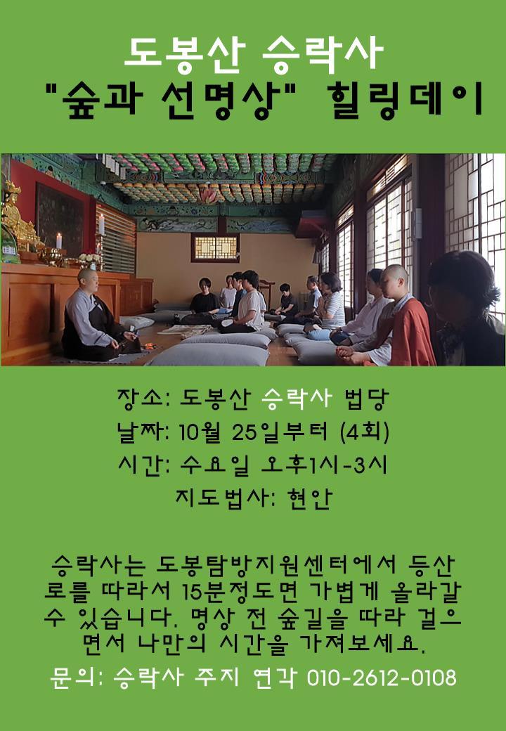 가을을 맞아 승락사에서 여러분을 초대합니다. 이 "숲과 선명상" 수업은 10월 25일부터 매주 수요일 오후 1시에 열리며, 종교, 나이, 인종, 출가 여부에 상관없이 누구나 참여할 수 있습니다. 참가비는 무료입니다.