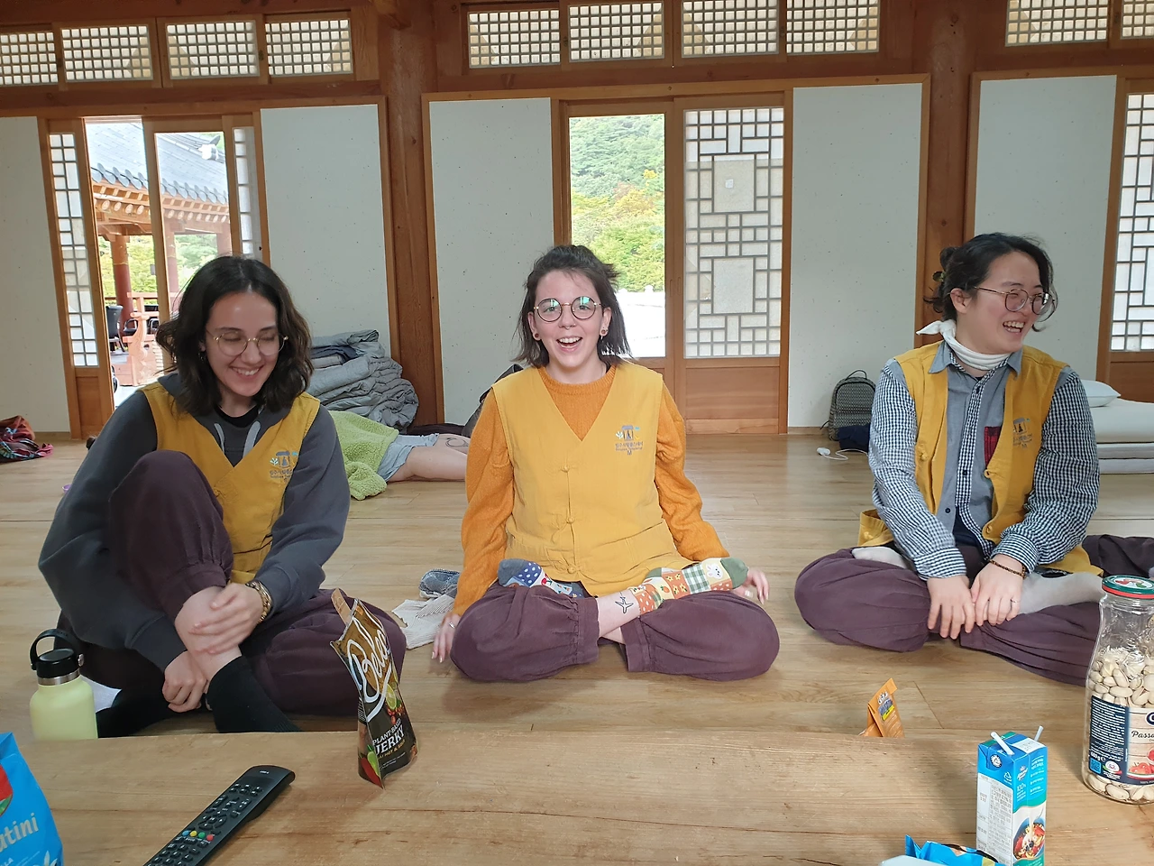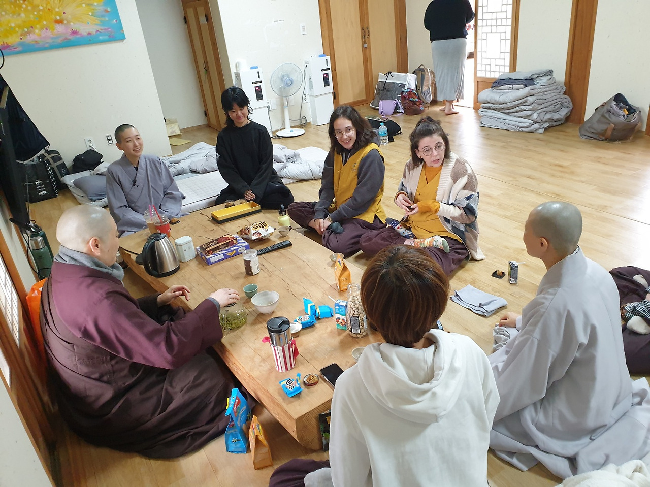 다들 열심히 등산하는 동안... 템플스테이에 온 2명의 젊은 미국인 아가씨들과 차를 마시며 이야기를 하게 되었어요. 불교에 관심이 많다고 해서 가부좌 가르쳐주고 간식도 나눠먹었습니다. 둘다 가부좌를 아주 멋지게 해냈습니다. 영어로 대화할 수 있는 사람도 여러명이고, 스님들이 수행하면서 겪은 여러 체험에 대해서 이야기를 해주니까 너무나 기뻐하면서 많은 질문을 했습니다.