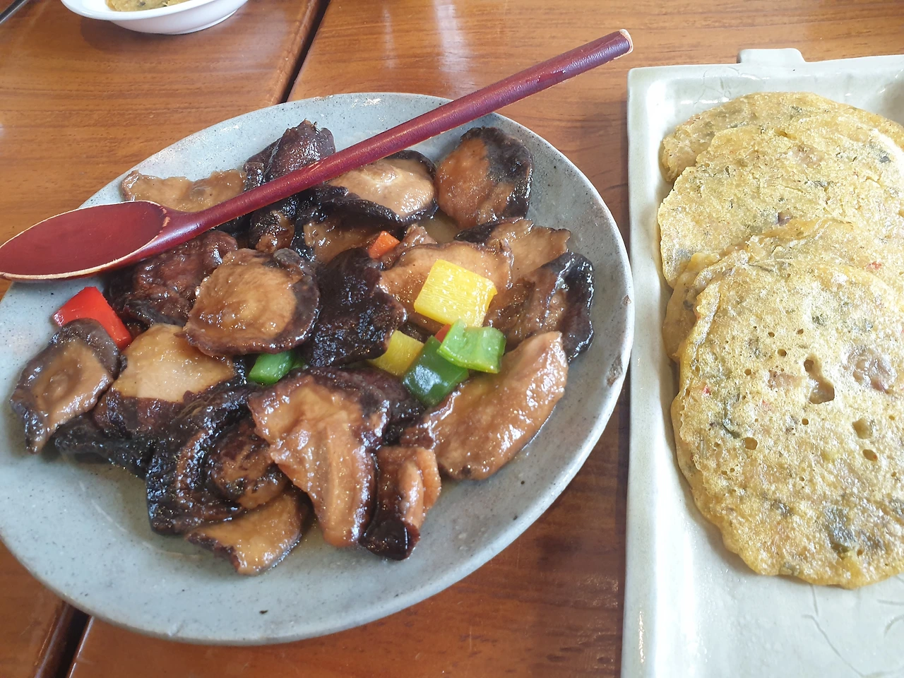 우리 3명은 일단 들깨 수제비, 비빔밥, 호두 만둣국을 시켰고, 다들 잘 먹는 편이라서 그냥 그걸로는 안될 것 같아서, 표고탕수, 오늘의 전, 두부 스테이크를 추가했습니다. 원래 우리가 다른 사람들에 비해서 잘 먹는 편인 거 같아요.