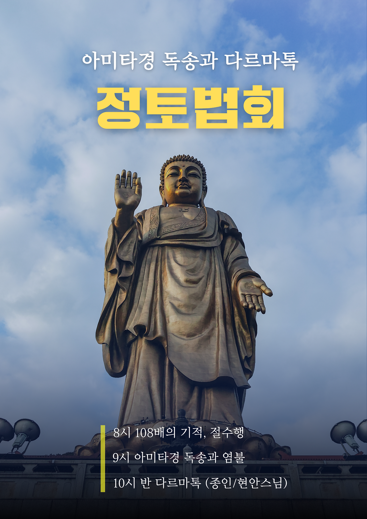 보라선원에서는 매주 일요일 오전 9시에 정토법회를 열어 아미타경 독송과 아미타불 염불 수행을 진행합니다. 새로 참여하시는 분들을 위해 정토왕생에 관한 기초 지식을 배우고 궁금증을 해소하는 시간을 마련했습니다. 이번 주 일요일부터 염불 수행 후 종인스님과 현안스님이 격주로 15~20분 정도 다르마톡을 진행할 예정입니다.