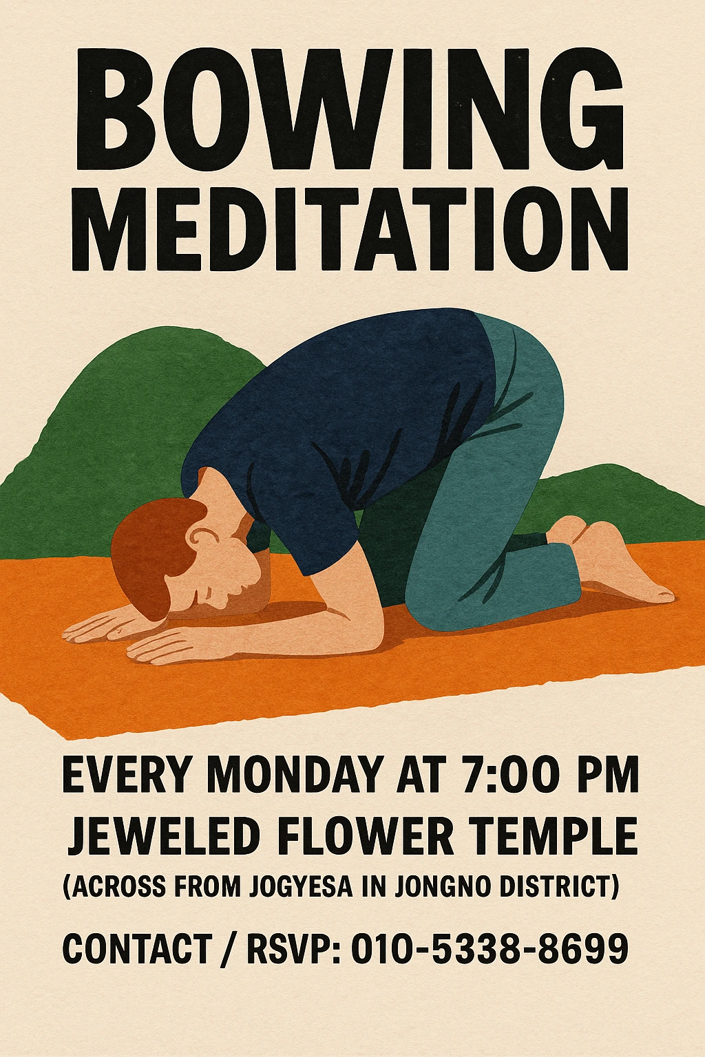 The American Weiyang School now offers Bowing Meditation every Monday at 7:00 PM at , located in Jeweled Flower Temple, the heart of Seoul near Jogyesa Temple.